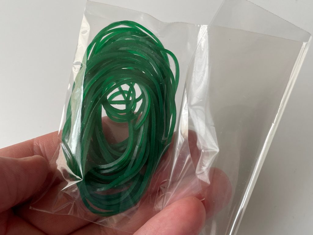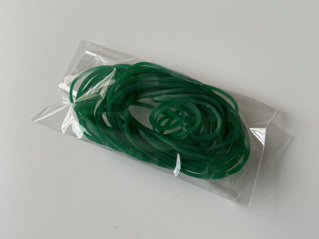 こちらが中身の「わごむ」です。深緑ですね、全部で30本入っています。黒板ふきシリーズですから、わごむは黒板の色が採用されているのですね!芸が細かい!