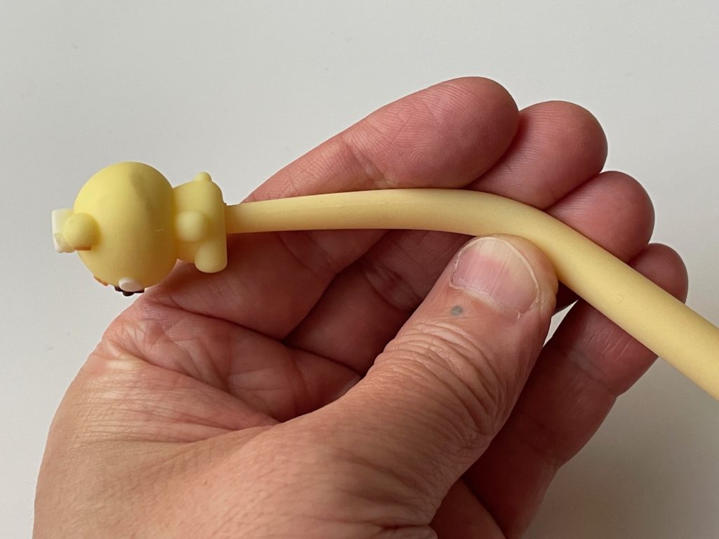 ちょうどカーブしはじめているところから先端はゴムなのかな?シリコン的なものかな?芯みたいなものがないのでめっちゃグラグラします。逆にグリップは芯があるのでさすがにグラグラしないです。