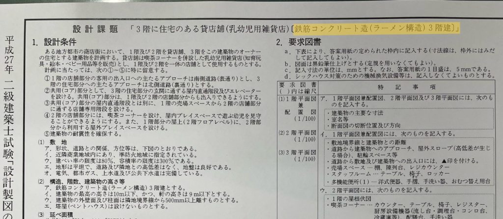 前回に引き続き平成27年の本試験課題文です。網掛けをご確認ください。3階建てと指定されていますね。