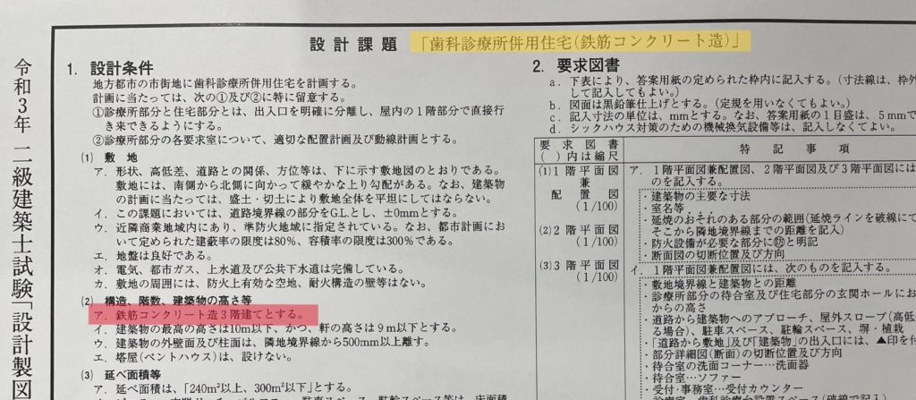 こちらは令和3年の本試験課題文です。この年は階数指定がありませんでした。試験当日に3階建てと判明しました。