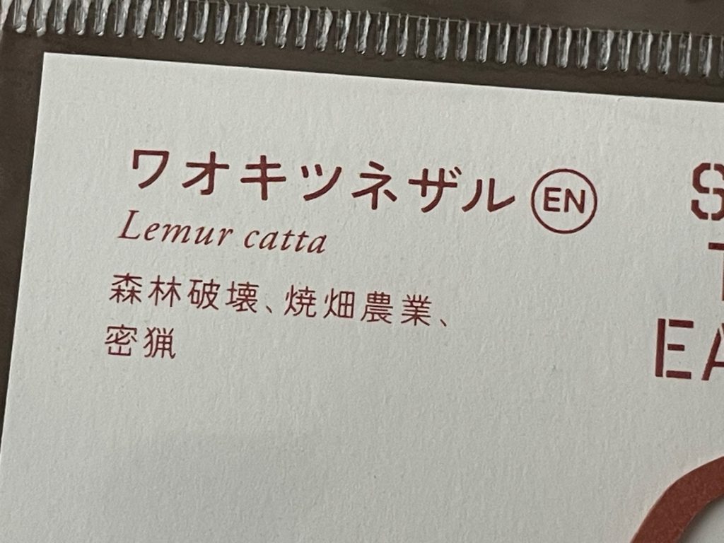 ぜーんぶすてきなデザインですよね。全12種類展開されています。ライチョウ、ワオキツネザル、クロサイ、ホッキョクグマ、トラ、イヌワシ、コウノトリ、ハシビロコウ、アジアゾウ、ジュゴン、シマフクロウ、クロマグロです。初めて聞くお名前もありました。トラとかホッキョクグマも絶滅危惧種なのですね!勉強不足でした。お値段ひとつ税込み330円です。