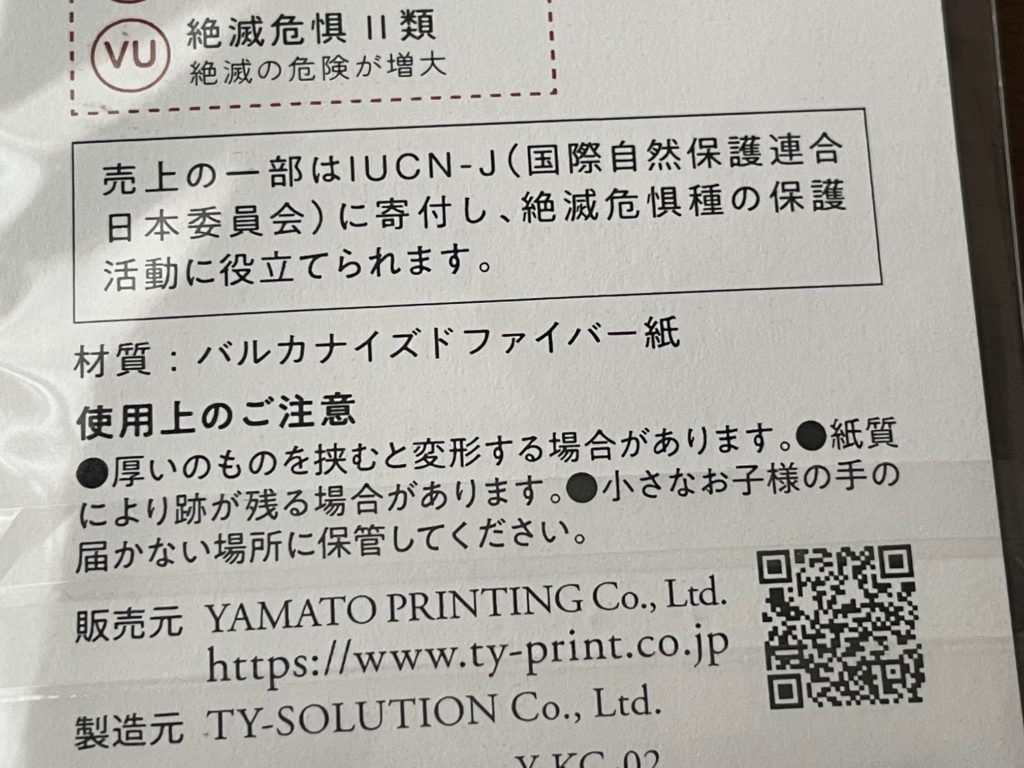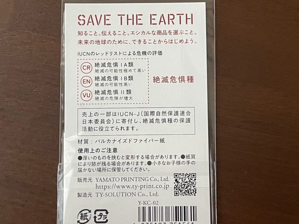 アイテムの裏面です。危機の評価についても説明されています。絶滅危惧種の中でも3段階で評価されるのですね。CR=絶滅危惧ⅠA類=絶滅の可能性が極めて高い、これが一番危機なのですね。