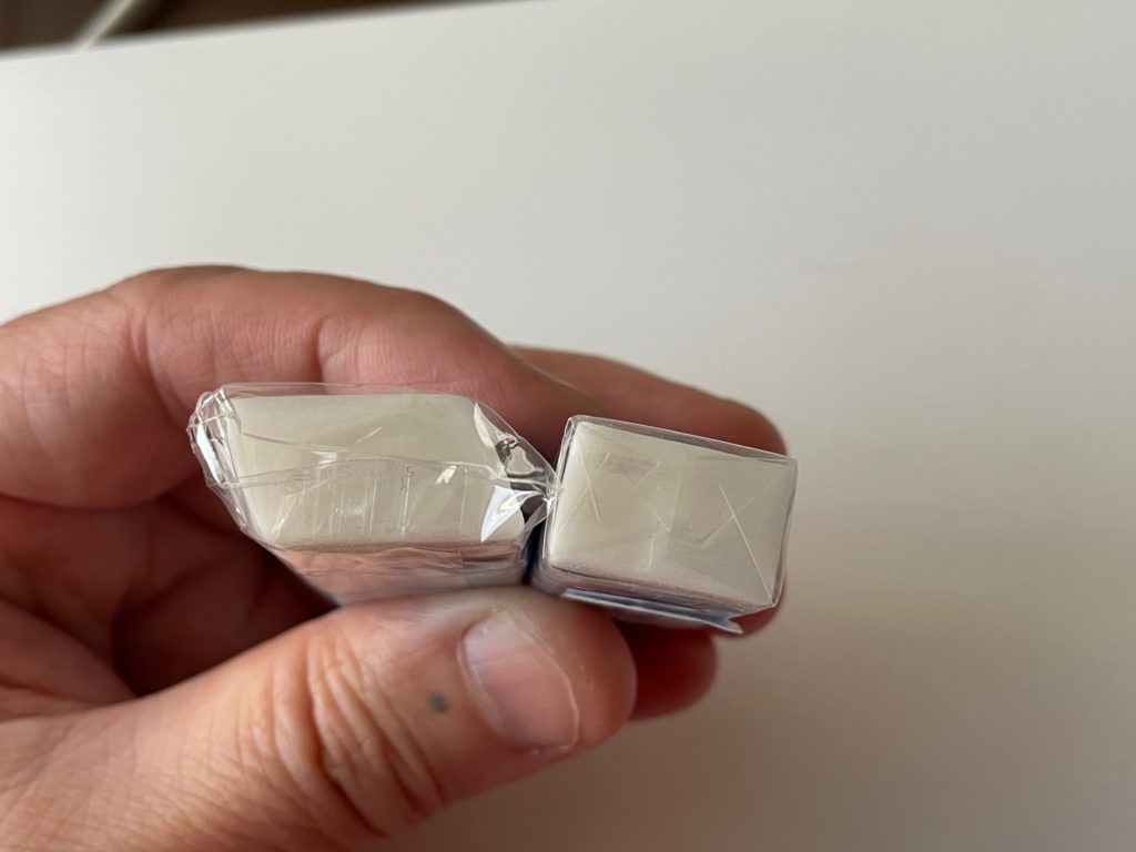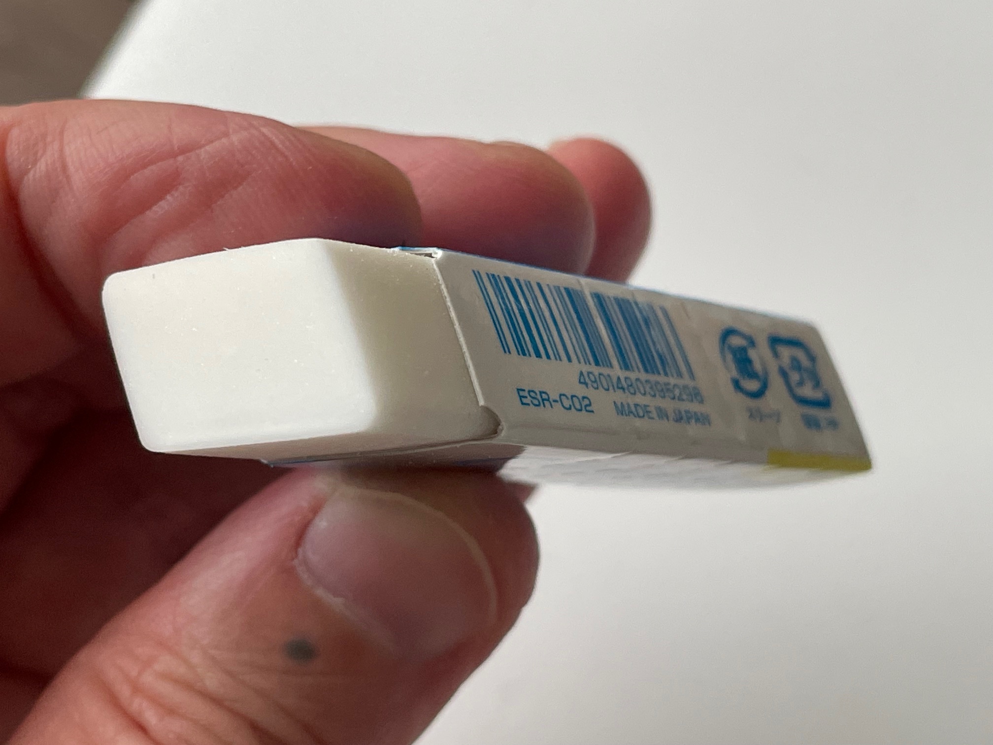 じゃん!こちらです! ネーミングは「よく消えるのに折れにくい消しゴム」でよかったでしょうか(笑) そして、やはり気になるのはスリーブ右上の「進化系」の表記ですね。真上からの画像だと少々わかりにくいので、、