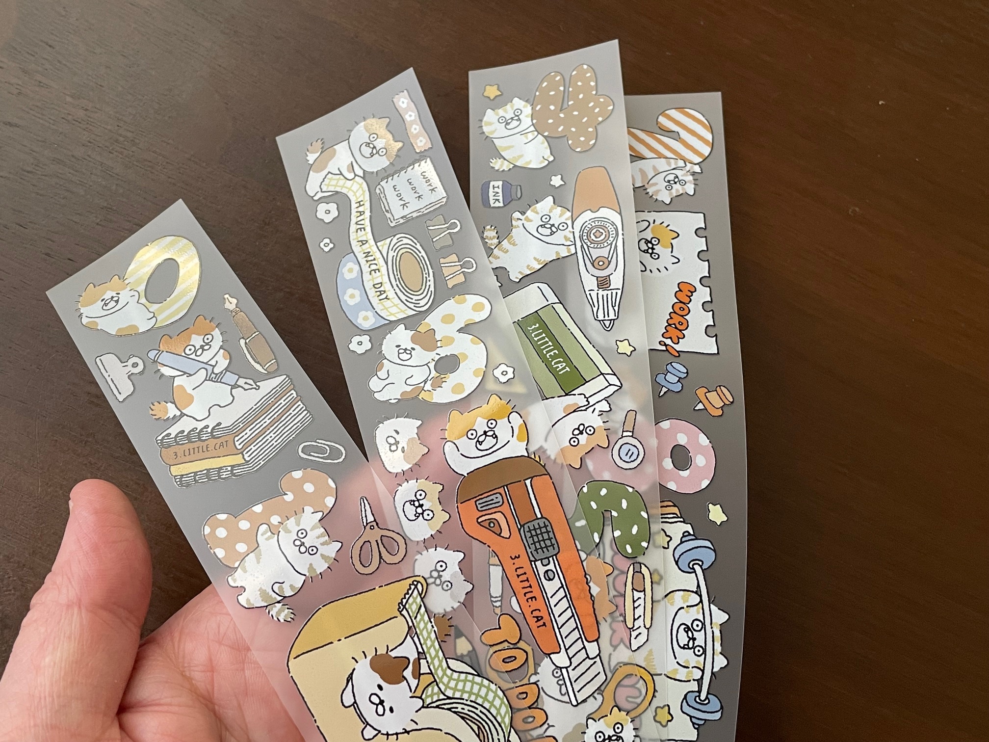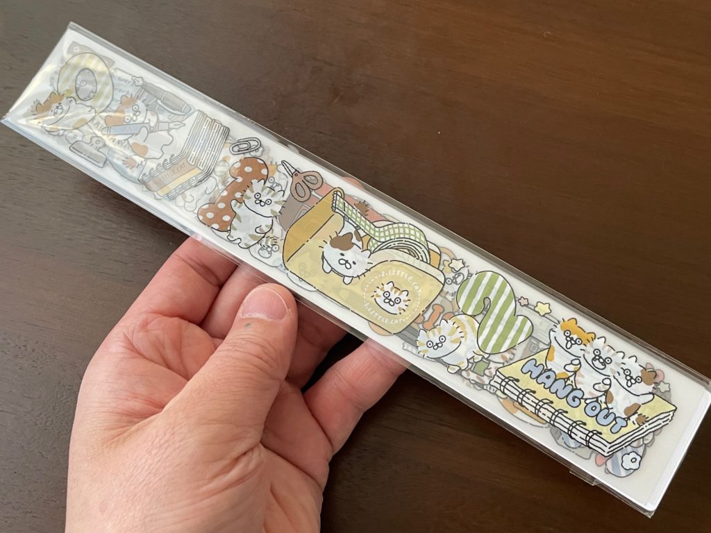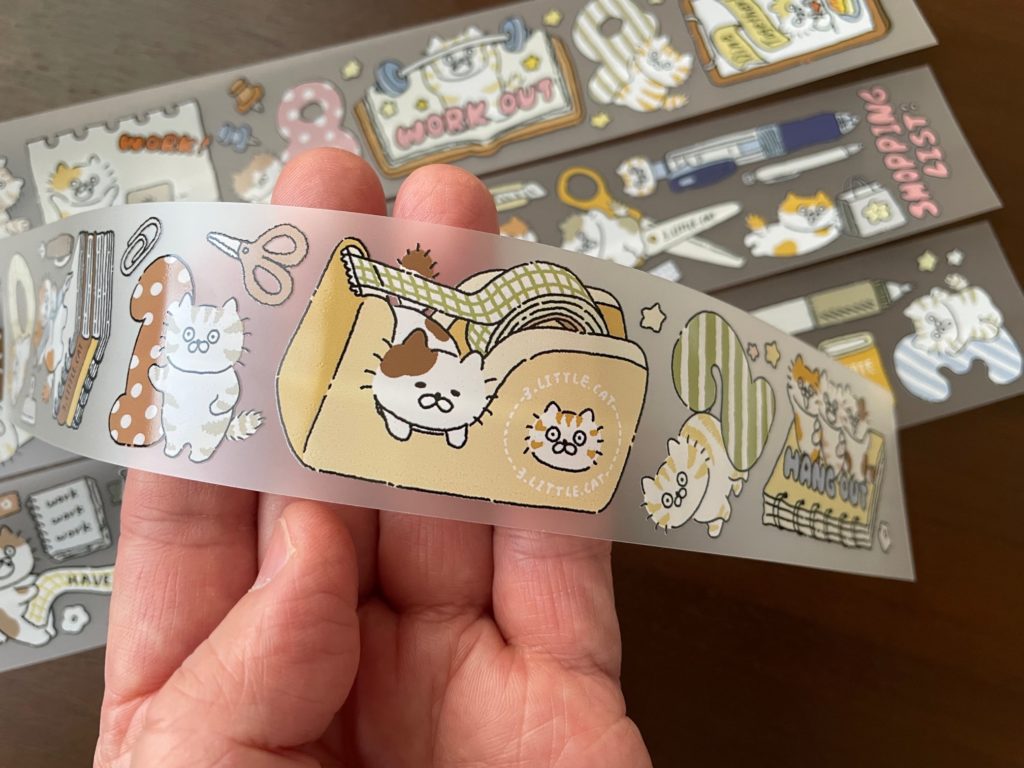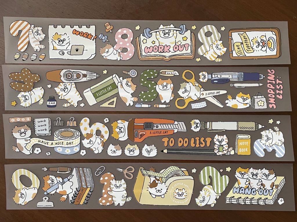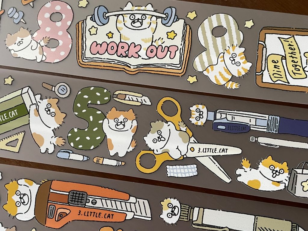 じゃん! いやー、どのデザイナーさんにするかめっちゃ迷いますね~。さんざん迷って我が家に来てくれたのが、3-little-catさんです!台湾のイラストレーターさん「手帳を書く猫」です!文具好きなので文具のイラストに惹かれたのが決め手です。でも他のアイテム群もみーんなカワイイですよ!これは開封が楽しみです!