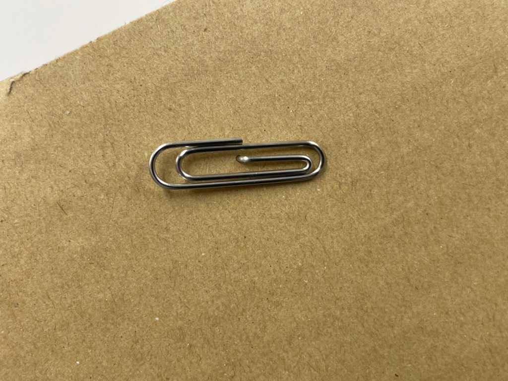 段ボールに指してみました。これだとクリップがひとつ、置いてあるようにしか見えませんが、、
