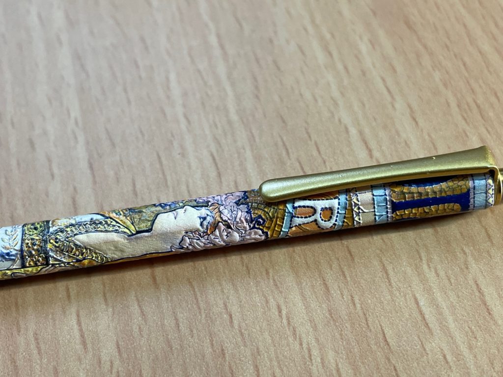 ジスモンダの一部(上のほう)です。1894年にサラ・ベルナールさん主演の演劇のポスターとして描かれたものです。主人公のジスモンダ女王、です。 この作品が一本のボールペンになるなんて、なんともステキだなあ。