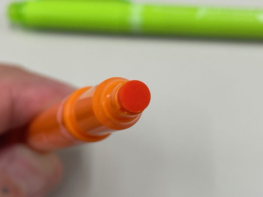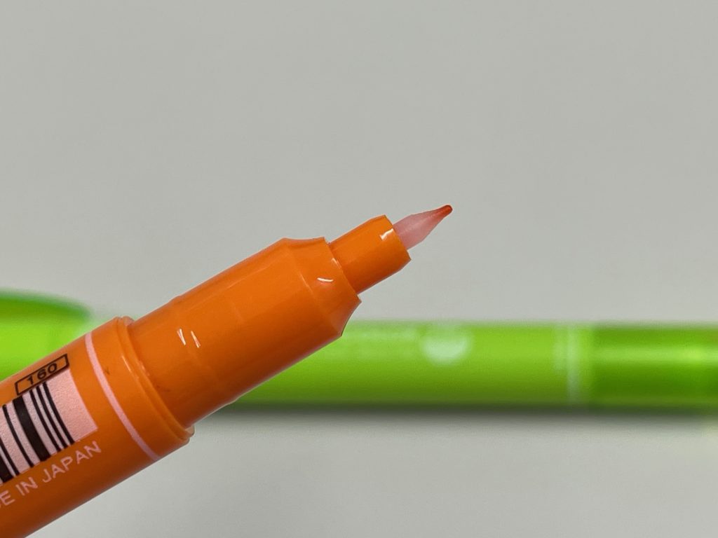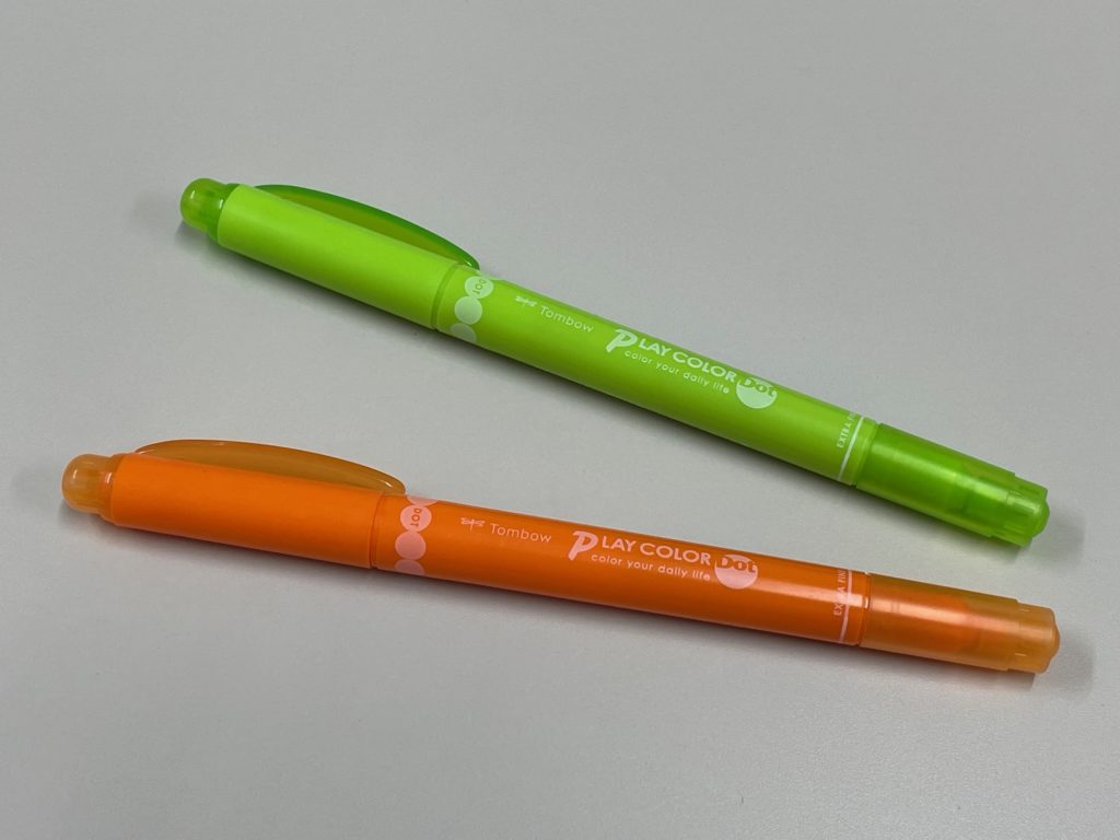 こちらです! 見た目は普通の蛍光マーカーペンですよね。強いて言えば、細いのと太いの、二つ使えて便利そうだな~、といったところでしょうか。でも、これ、楽しいのです!