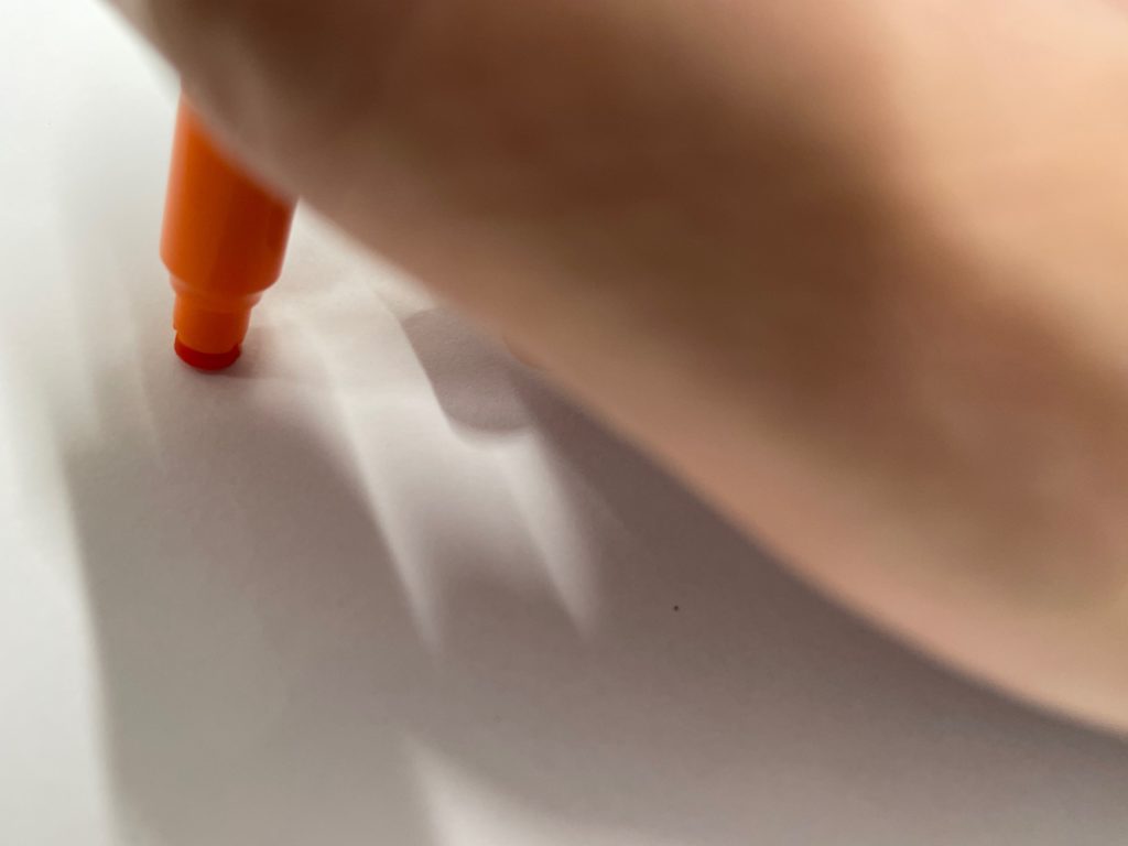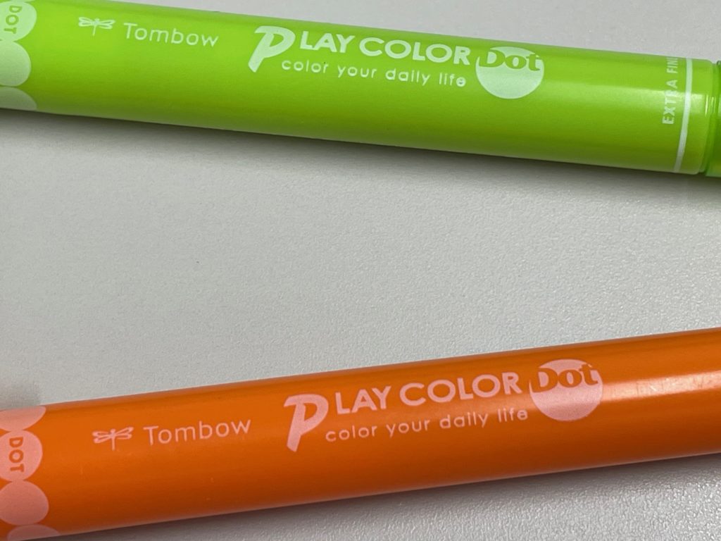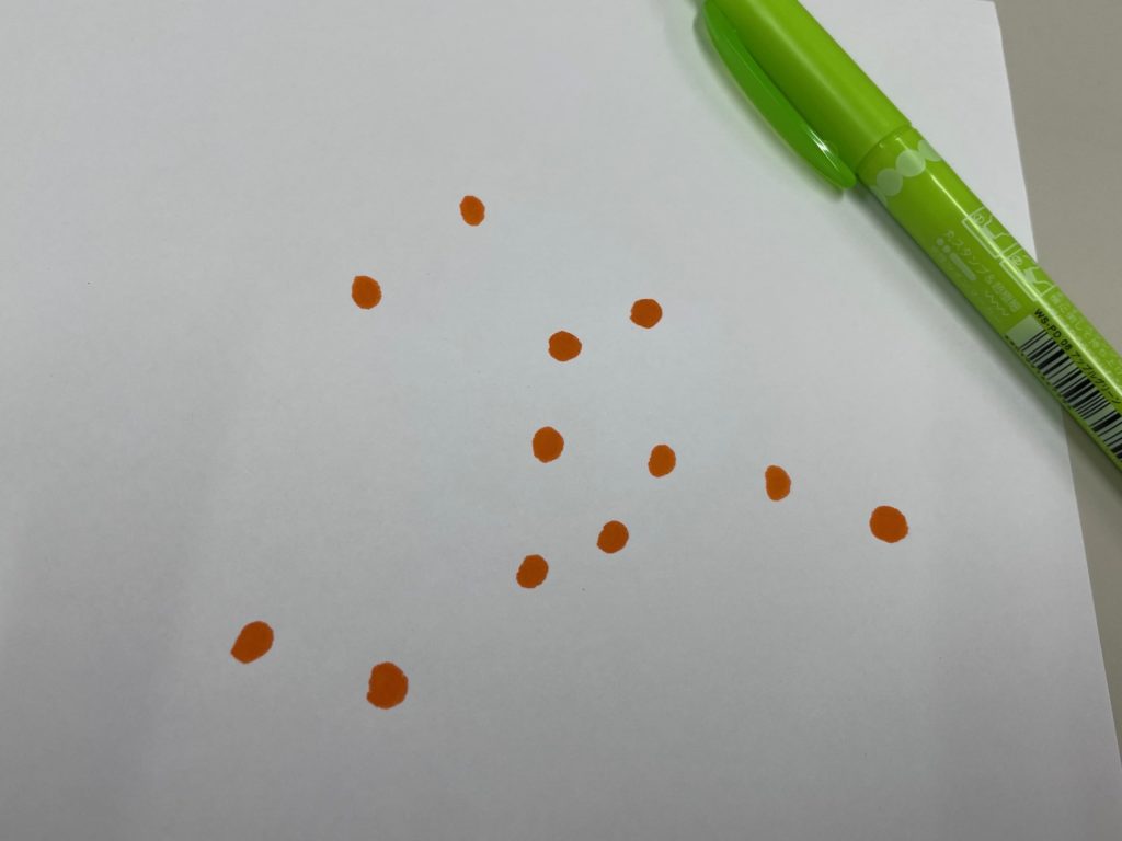 この「プレイカラードット」ですがお色は全12色!今回私が紹介しているのは「オレンジ」と「アップルグリーン」です。さあ、使ってみるぞ!! とその前に、、ちゃんと垂直に押さないと、ちゃんと「まる」が表現できないぞ!ということで、、