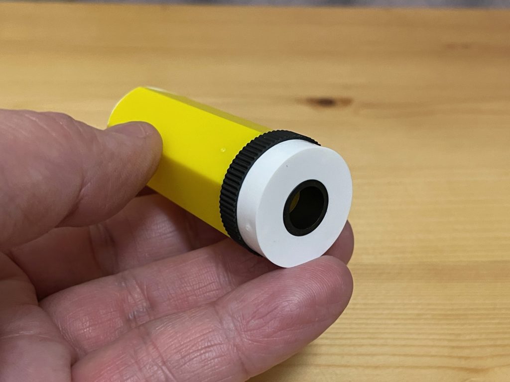 手に取ってみました。こうするとサイズ感がわかると思います。具体的なサイズですが、直径約24mm×全長74mm、です。直径8mm程度までの鉛筆に対応とのことなので、普通の鉛筆は大丈夫ですね。
