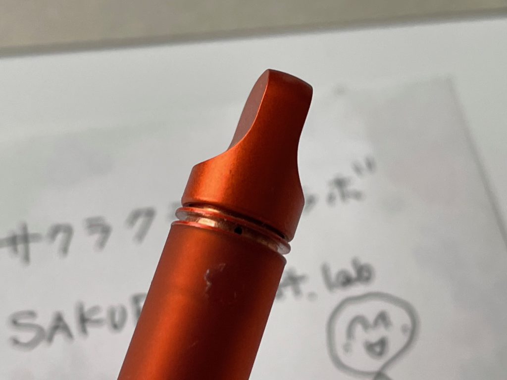 サクラマークすてきです。そのサクラの上部、ここが個人的に最大の特長だと思っています。このつまみみたいなところ(頭冠)をひねると、ペン先が登場します。ひねると、わりと重みがあるのでそれがまた良き!「さあ、書くぞ!」という気持ちにさせてくれます。