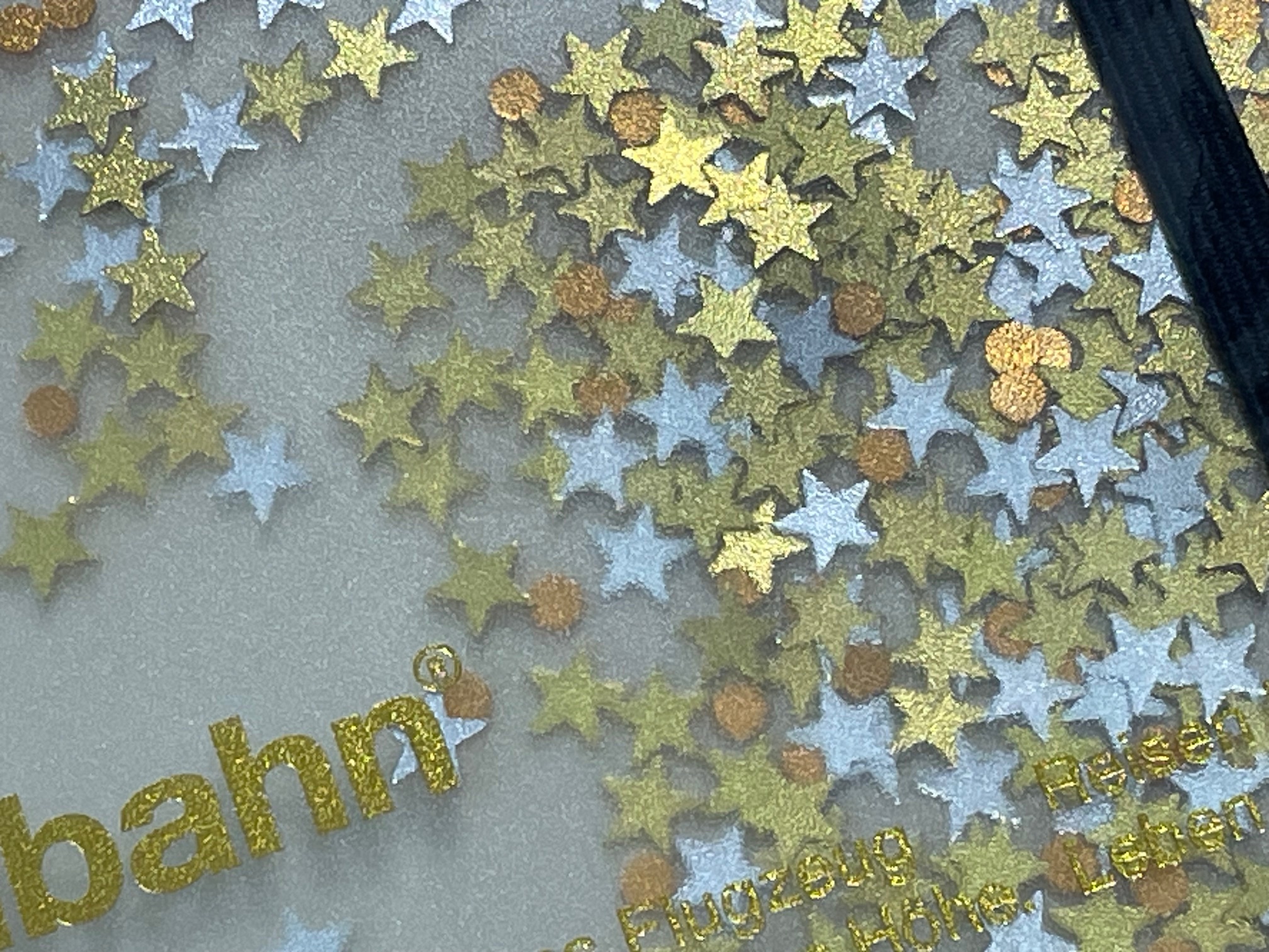 スパンコールかわいいです!お星さまが3種類でしょうか、明るめのゴールド、ゴールド、白(シルバー?)。あと円みたいなものがありますね。明るめのゴールドと銅のような色ですね。