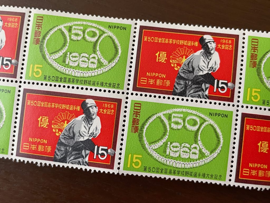こちらは1968年発行、第50回全国高等学校野球選手権大会記念切手です! 節目の年はこのように切手になることが多いのですね! ちなみにこの年、奈良県の智辯学園が初出場した年でした! 2026年センバツでは惜しくも準優勝でした。他、今でも有名な高校もしっかり出場していました。