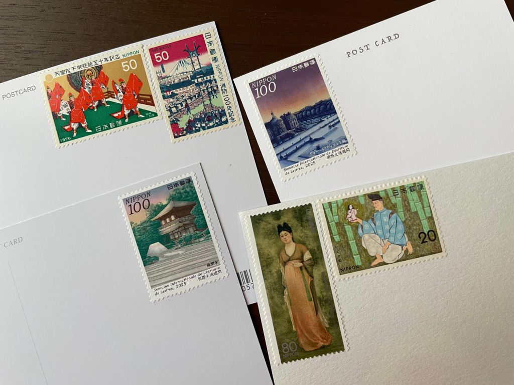 私がカードに手紙を書く際、一番最初に切手を貼ります。切手は大きさ大小ありますから切手を貼り、空いたスペースに住所やVIA AIR MAILなどを記していきます。 いかがでしょう? 2025年に発行された切手も一部ありますが、きっと海外の皆さん喜んでくださると思います!