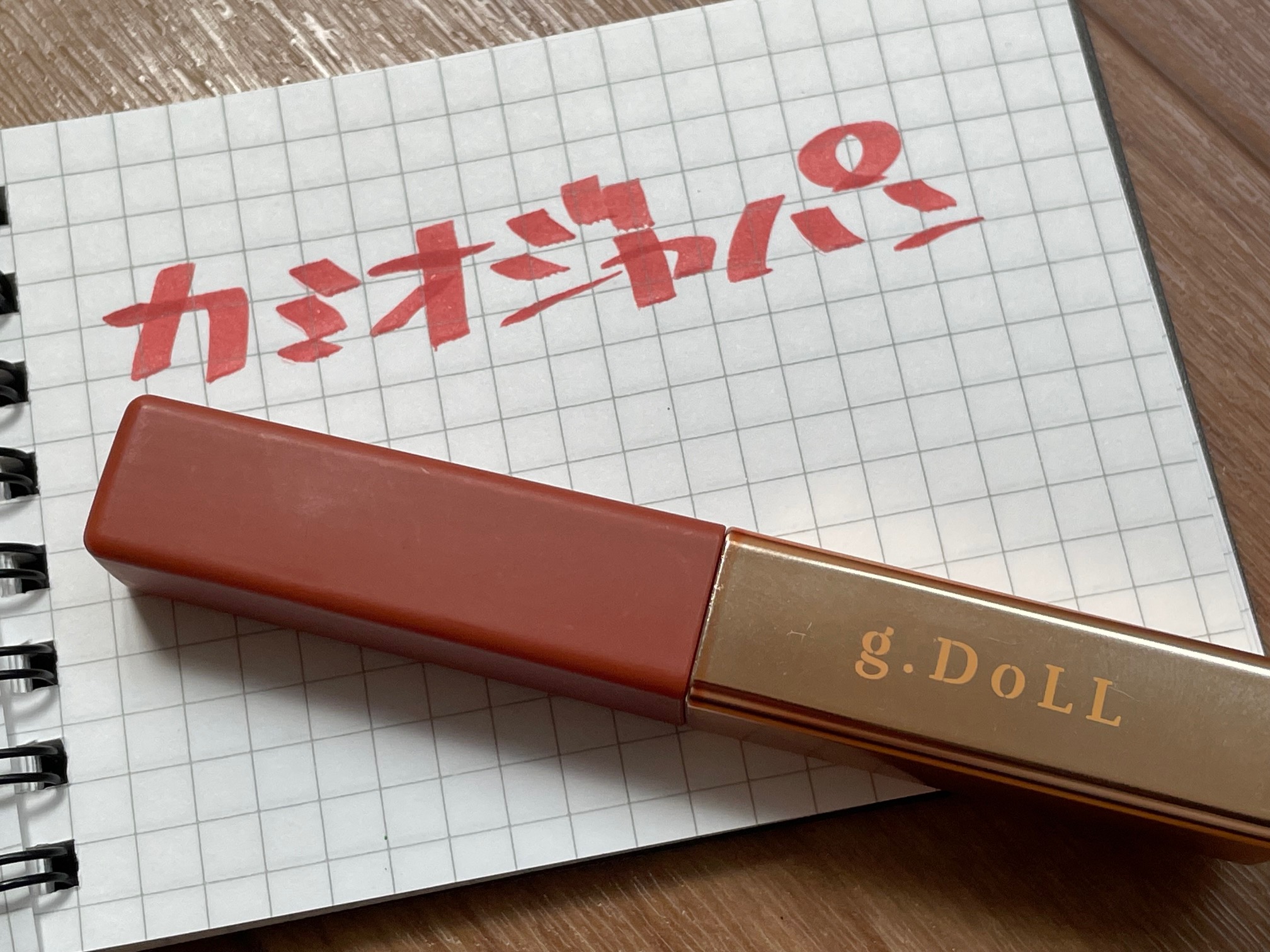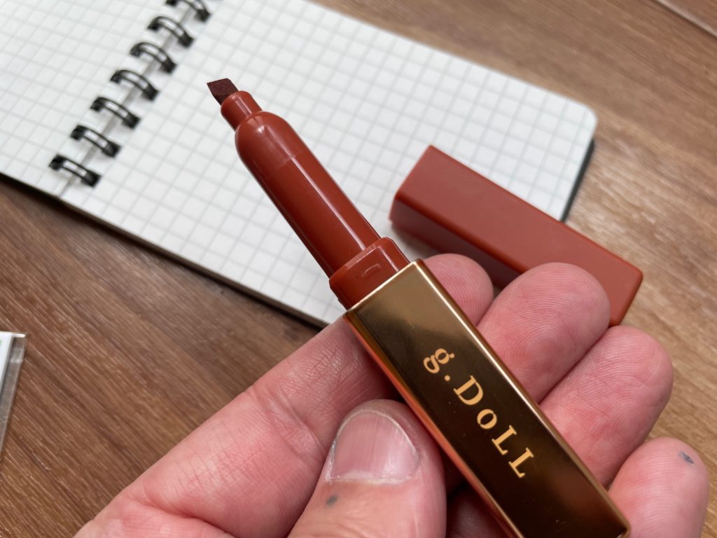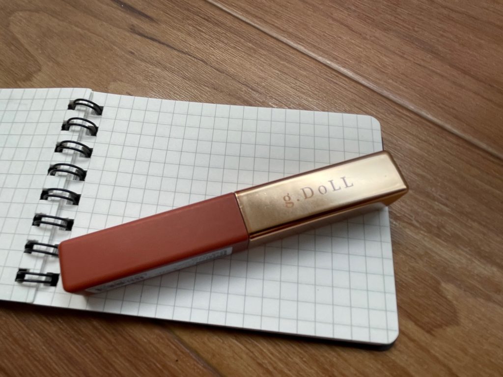 キャップを開けました~。茶色のように見えますが、こちらの色は「コーラルレッド」とのこと。g.DOLLのロゴが見えますが、ごめんなさい、どのような意味かちょっとわからないです。他、メープルローズ、オレンジ、ラズベリーピンク、 ベビーピンク、ペールピンクの6種類。乙女心をくすぐります、すべて赤・ピンク系で攻めています、GOODです! お値段ですが税込み242円になります。