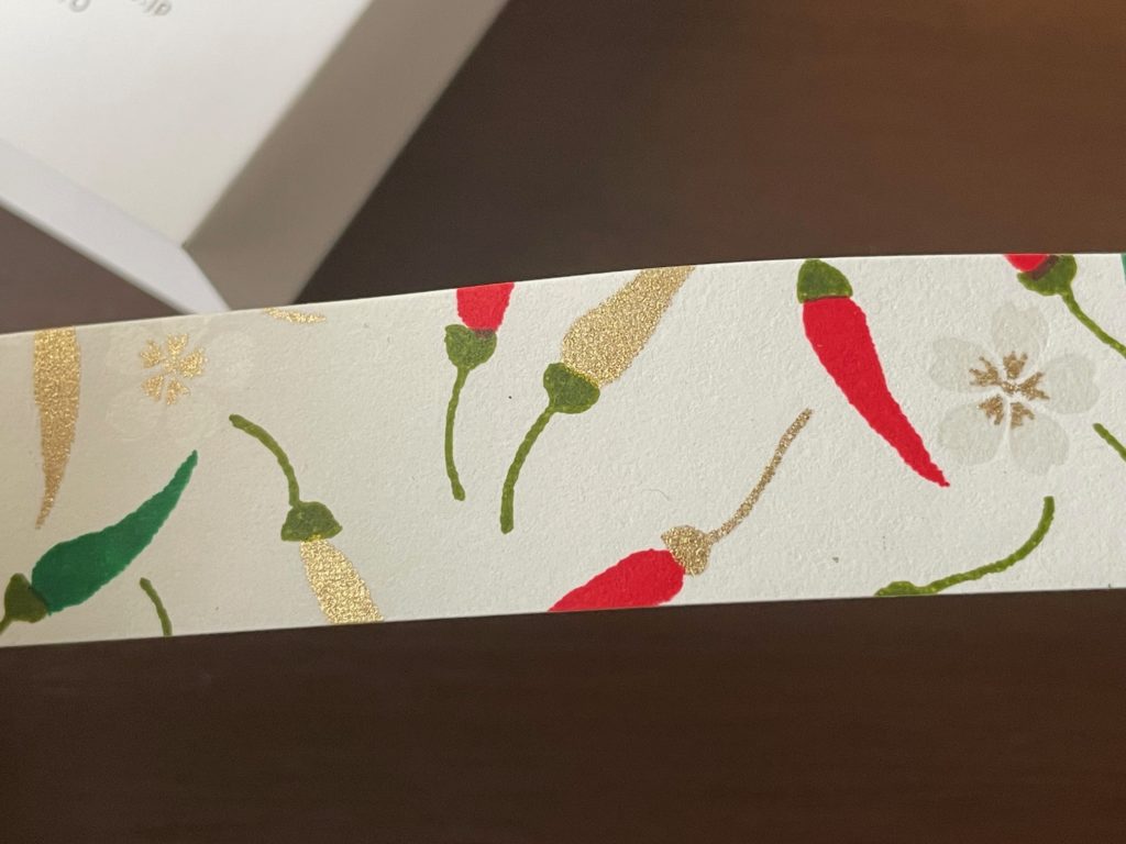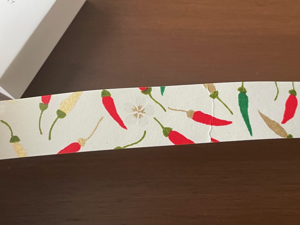 私が購入した文具店には何種類くらいおいてあったのでしょうか。たしか、30種類くらいはあったような、、お店で5分くらい悩んでいましたから(笑)。で、選んだのがコチラです! 唐辛子、でしょうか。なぜコチラを? 以前紹介した尚雅堂さんの和紙では、わりと派手な柄を紹介したからかな。