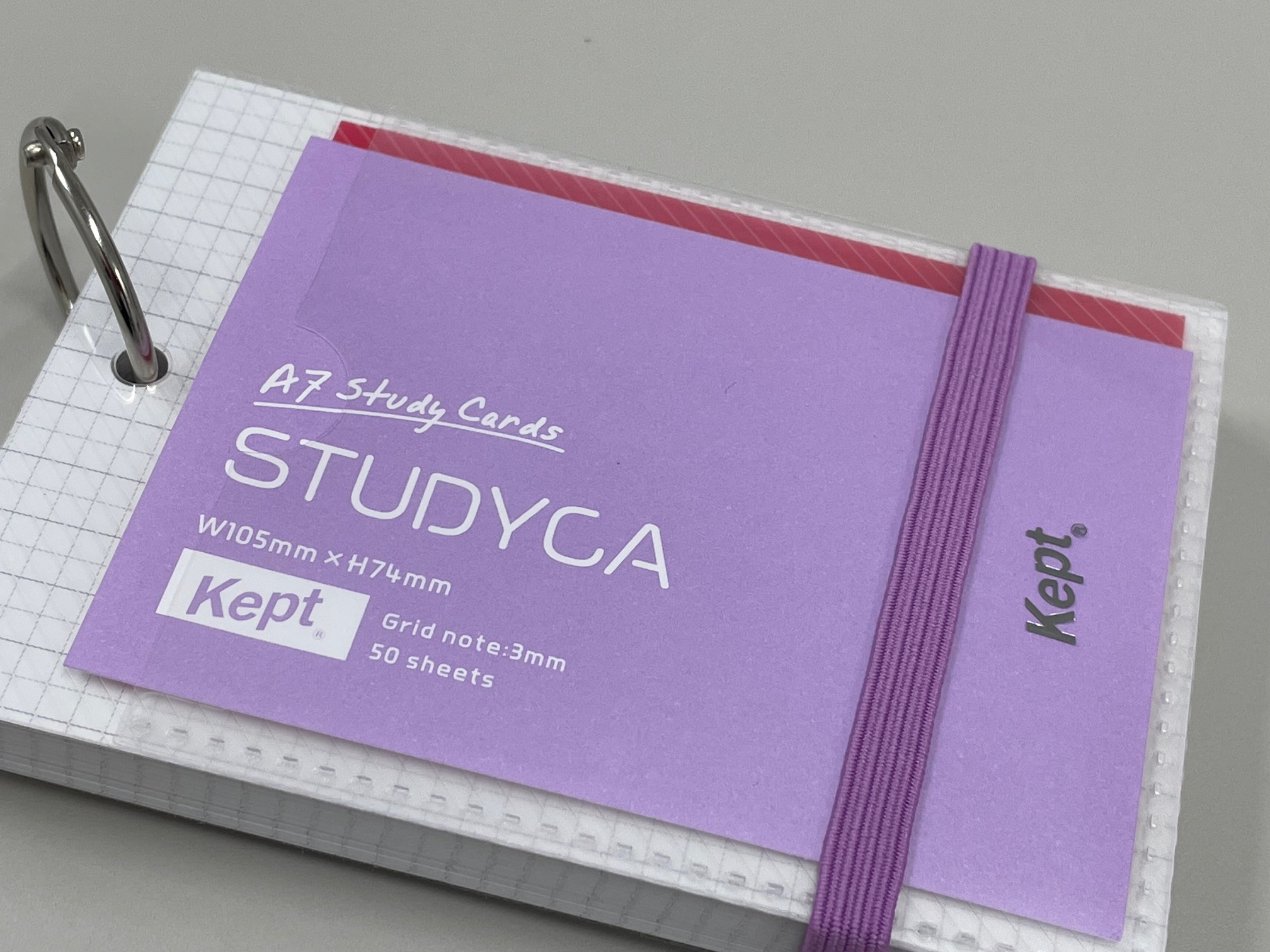 じゃん!なんだか勉強が楽しくできそうな予感がします。従来の単語カードと比べると倍程度の大きさですが、自分好みの単語カードに仕上げることができそうです。画像の色は「パープル」ですが、他ブルー、グリーン、グレーがあります。どれも淡い色合いなのが爽やかさを演出してくれています。お値段税込み660円ですから、単語カードとしては少々お高いかもしれませんが、それでも皆さんの勉強を大きく助けてくれるアイテムになります! また、A7サイズですから8枚上下左右に並べるとジャストA4サイズになるのでコピーしたりするときなどわかりやすいですよね!