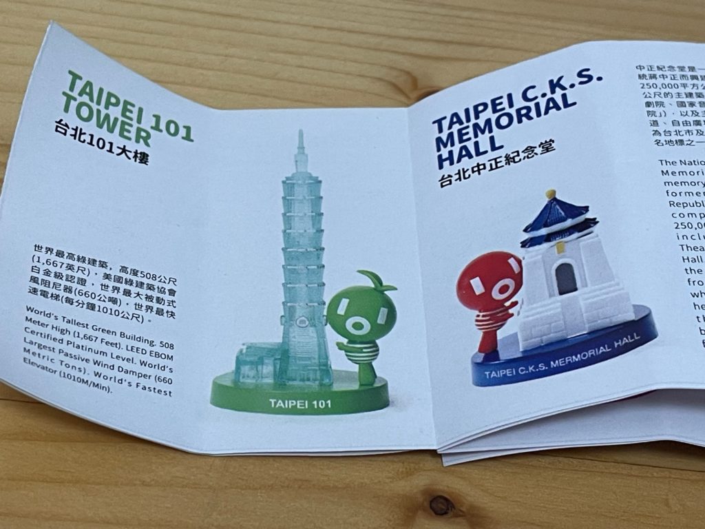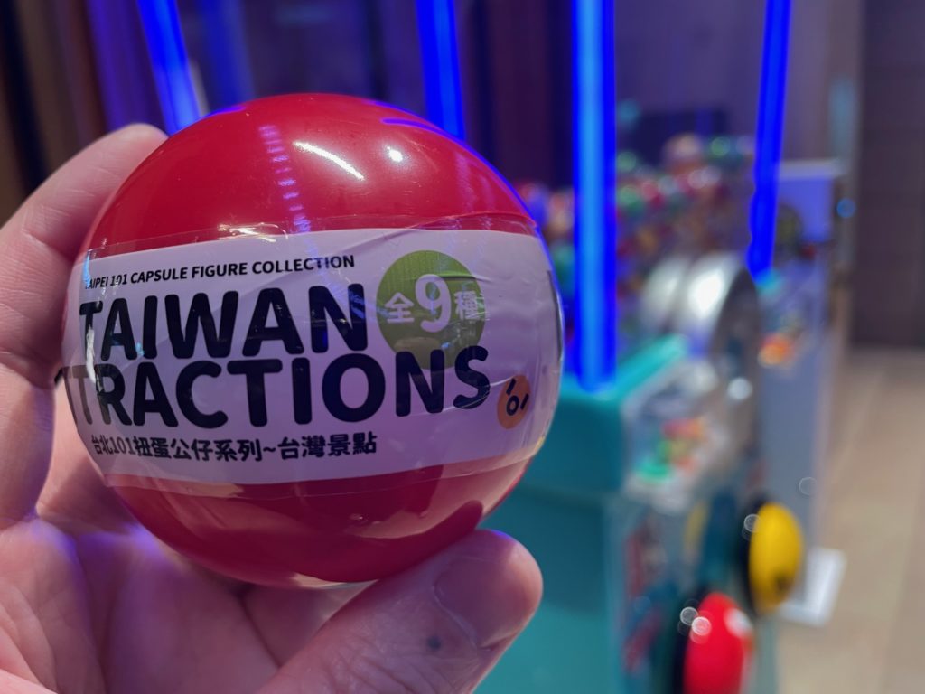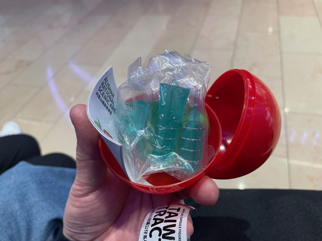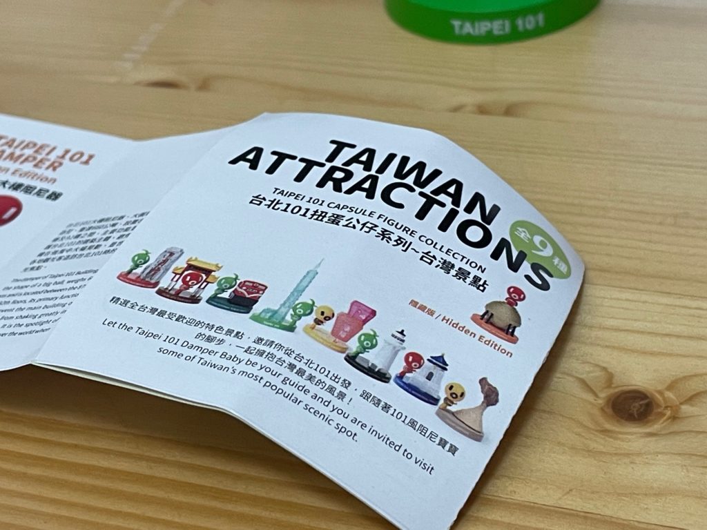 で、ガチャガチャにチャレンジです。ちなみに全部で9種類。すべて台湾の観光に関するフィギアです。参考までに、台北の中正紀念堂、台中の日月、潭野柳の女王頭、阿里山のトロッコ、台北101のダンパー、台北101花蓮の太魯閣、平溪の天燈あげ、墾丁国家公園。