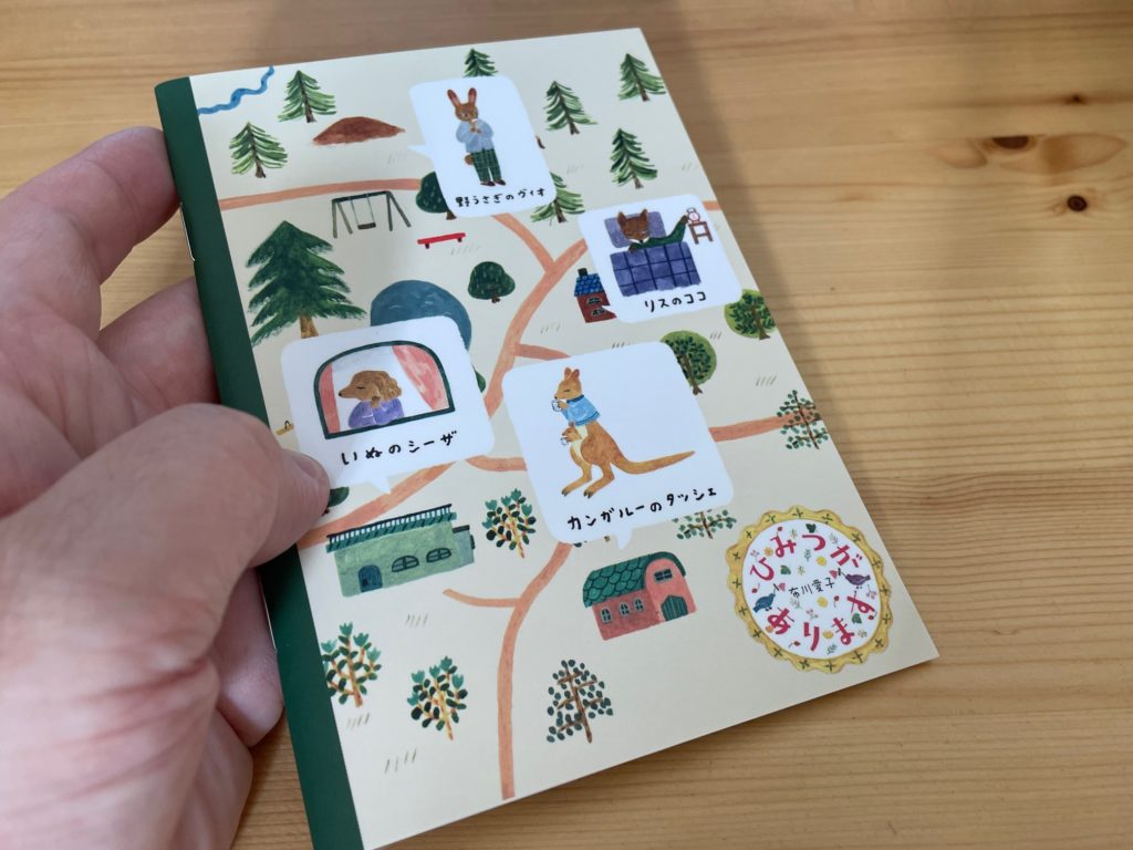手に取るとこのような感じのサイズ感です。イラストがとってもかわいいので、ミニノートが心地よいサイズなのかも! A6サイズなので、縦148mm×横105mmです。