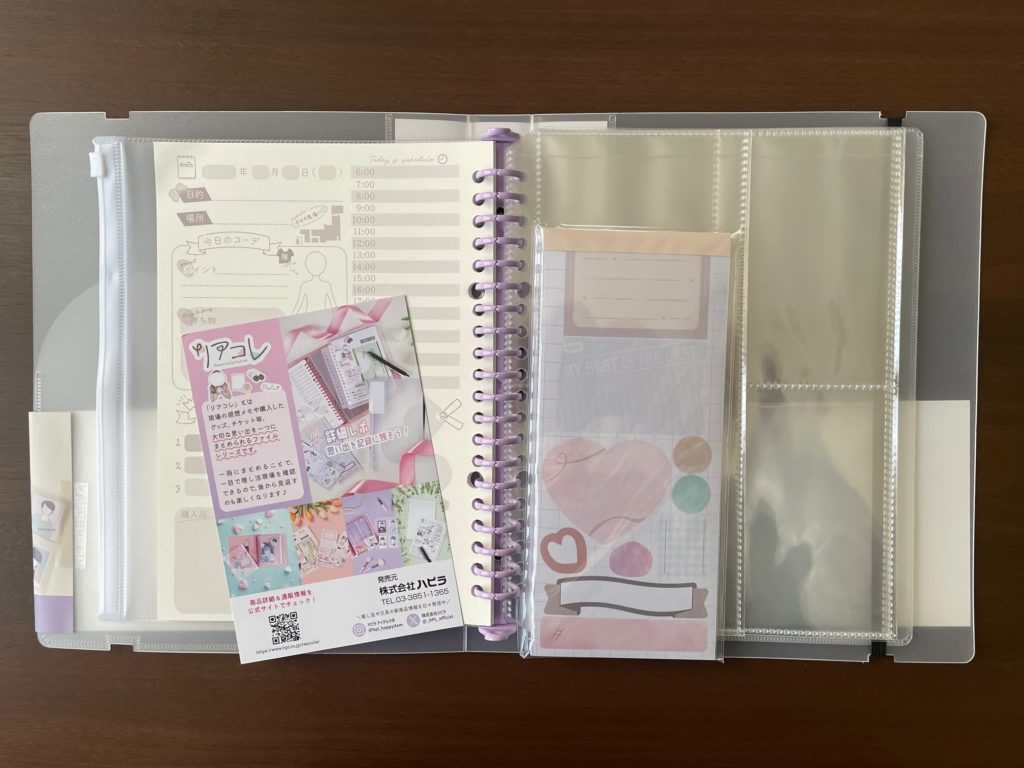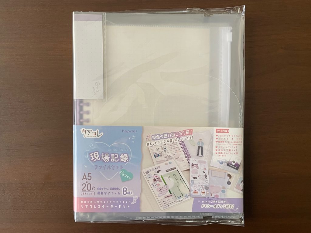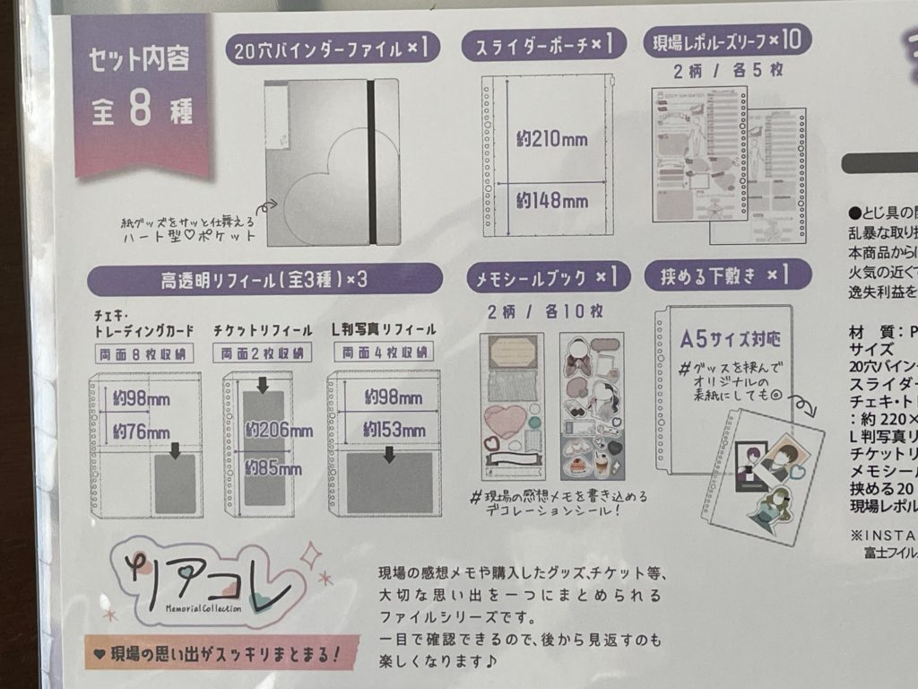 説明書きです!セット内容全8種!20穴バインダーファイル・スライダーポーチ・現場レポルーズリーフ・高透明リフィール×3種・メモシールブック・挟める下敷き、以上です! ちょっと前は推し活って、あまり人に言えないみたいな雰囲気がありましたが、今は文具店に行っても推し活グッズをたくさん置いてありますし、推し活の認知度がかなり上がった気がします。とても良いことだと思います!