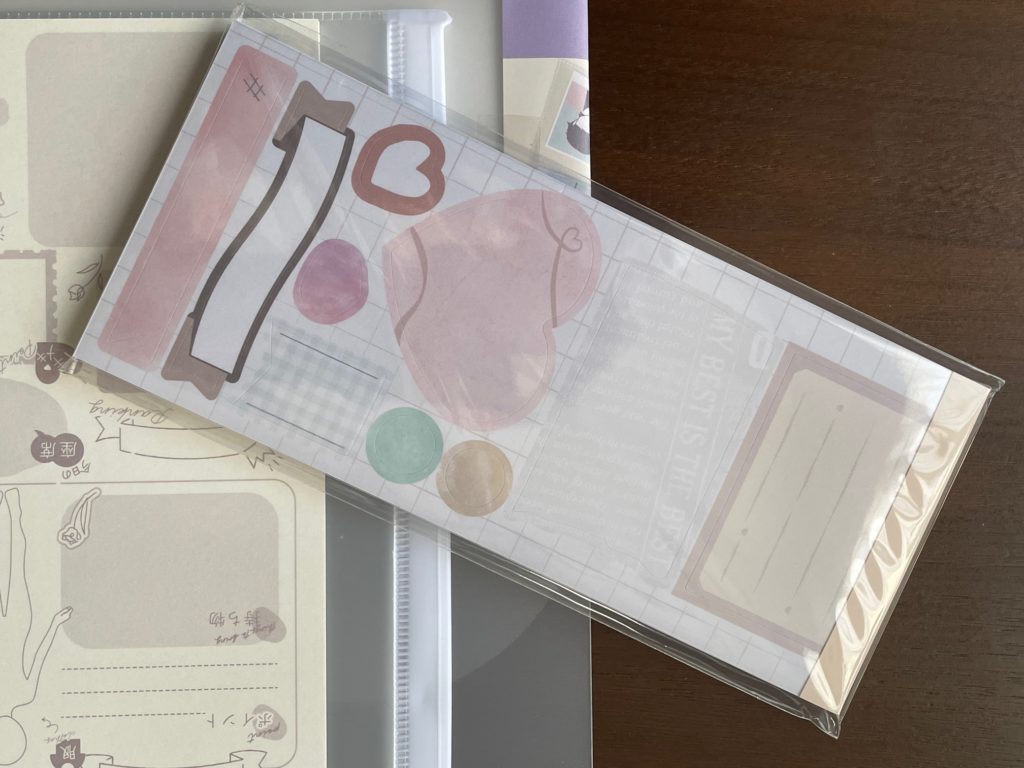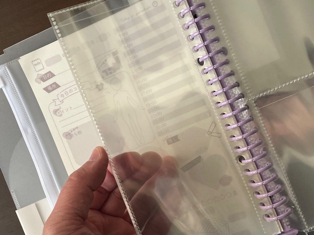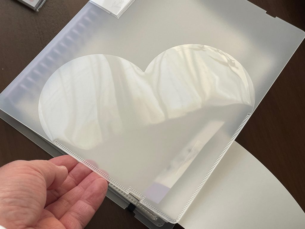 半透明なので、ちょっとうっすらしていて分かりにくいかもしれませんが、こちらが表紙です。うっすらと見えるハートマークがキュートですよね! 表紙なので、一旦ハートのところに紙類などをしまうことができます。また、頑張ってこのハートサイズに合わせて挿入できたらハートが一気に映えそうですね!