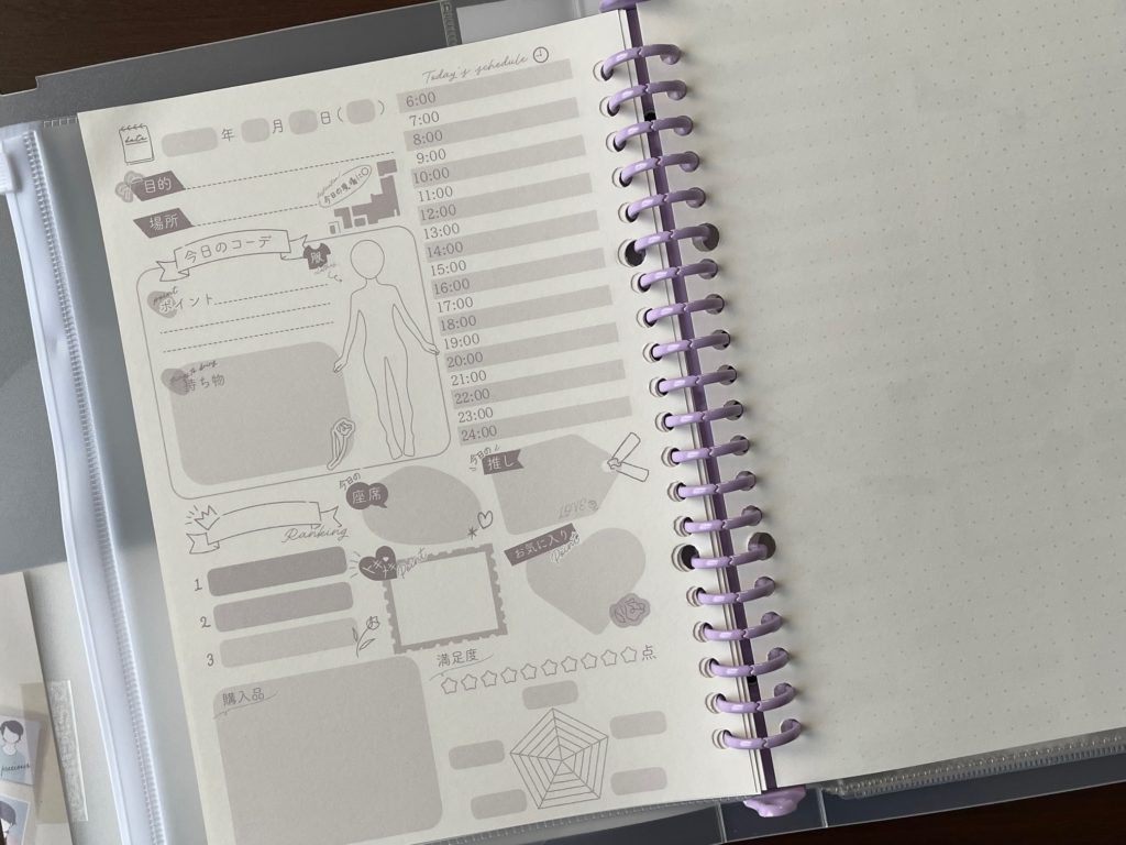 「現場レポルーズリーフ」なるほどです!かなり細かいところまで書けるようになっています。例えば、コンサート当日。1日の行動、服装、ときめきポイント、当日購入グッズなど、いろいろ書けるようになっています。こういうのって、書いている瞬間も楽しきですが読み返すのも楽しきですよね!これだけ詳細を書けたら、読み返した時記憶が鮮明に蘇りそうです!