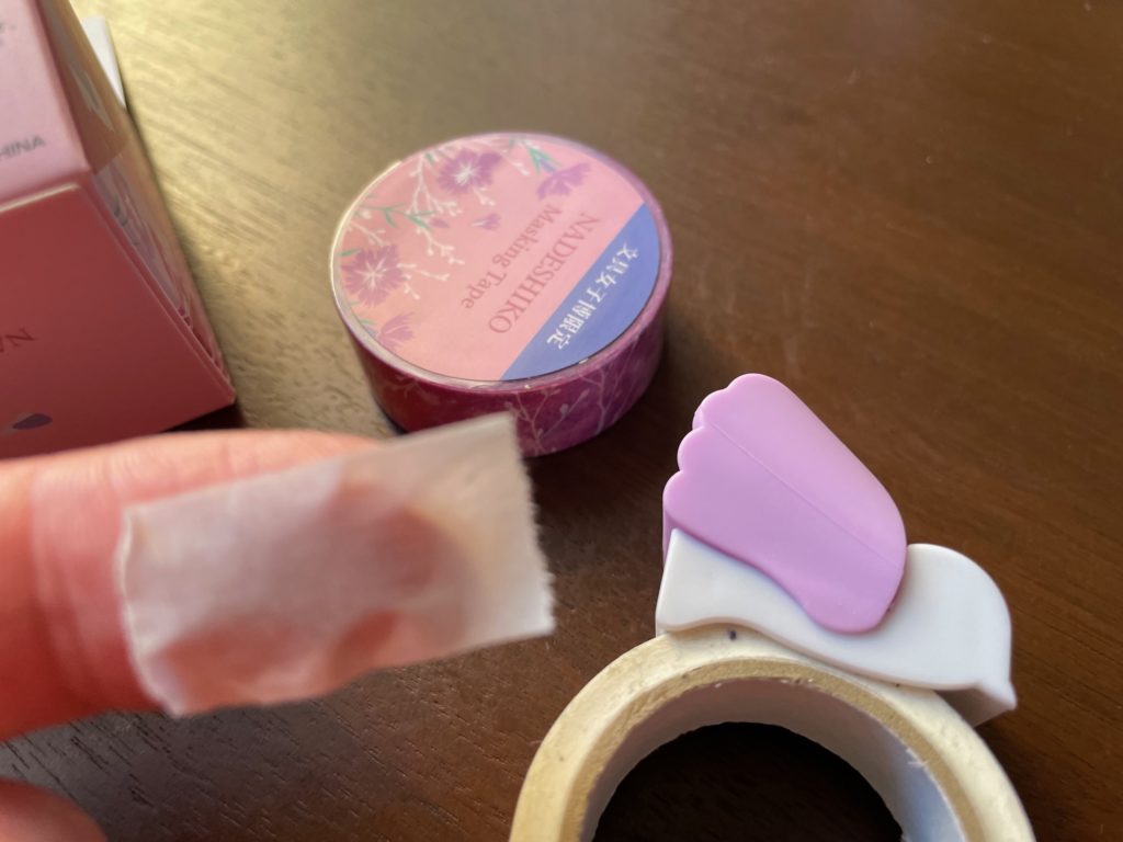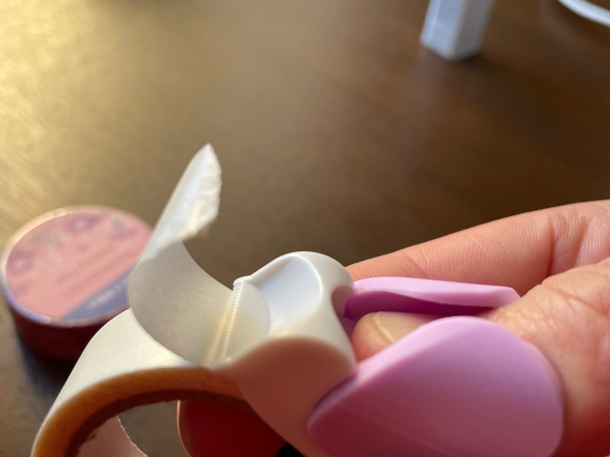 はい!切ったあとです!綺麗に切れています。 テープカッターが固定ではなく、切る都度親指に装着するので、こちら一つでいつでも複数のマスキングテープを切ることができちゃうところがかなりのプラスポイントでしょう!ナイスアイディアです!そんなアイテムを世に出してくれているのが、、