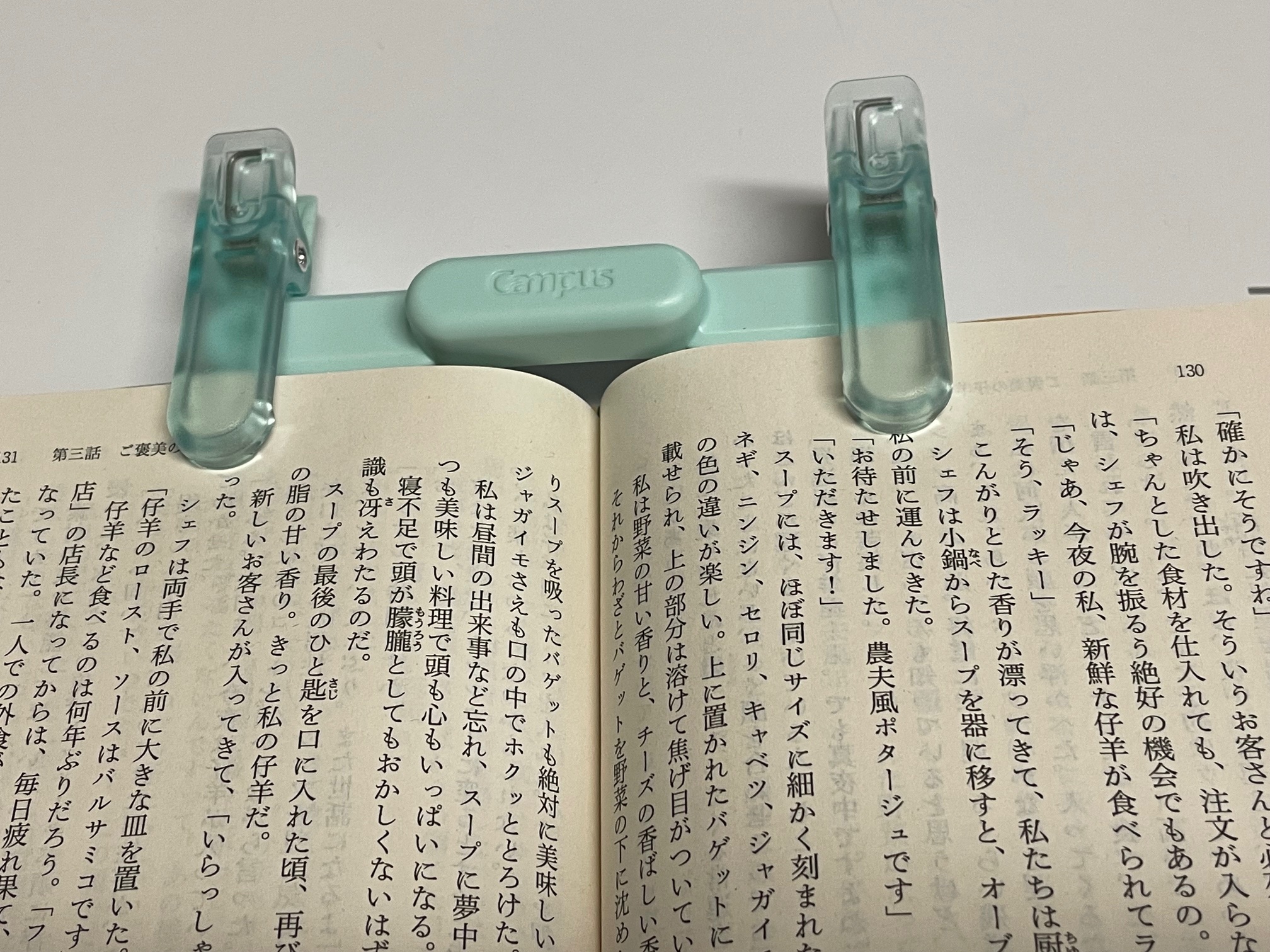 逆側から撮影しました。多少角度は不均等ですが(それはそうだ)、手を離しても見開いた状態で確実に読むことが可能です。
