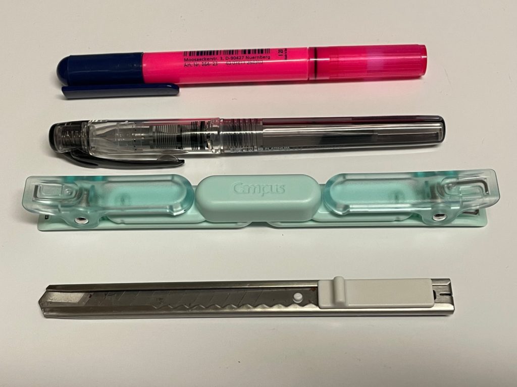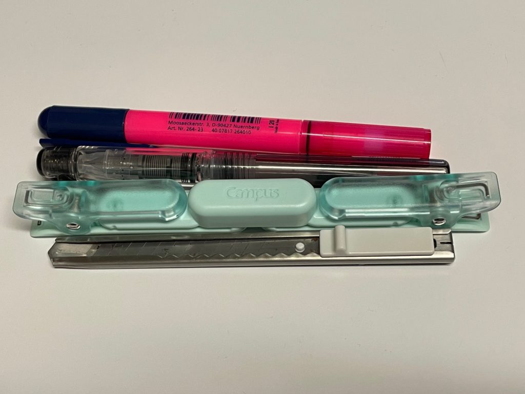 他の文具たちにも登場していただき、サイズ感を確認しました。ペンやカッターと比べて2センチ強長いくらいですね!サイズ感は問題ないでしょう。あのサイズ感ボリューミーなクリップがペンケースに入るなら、魅力度アップだと思います~(^▽^)/