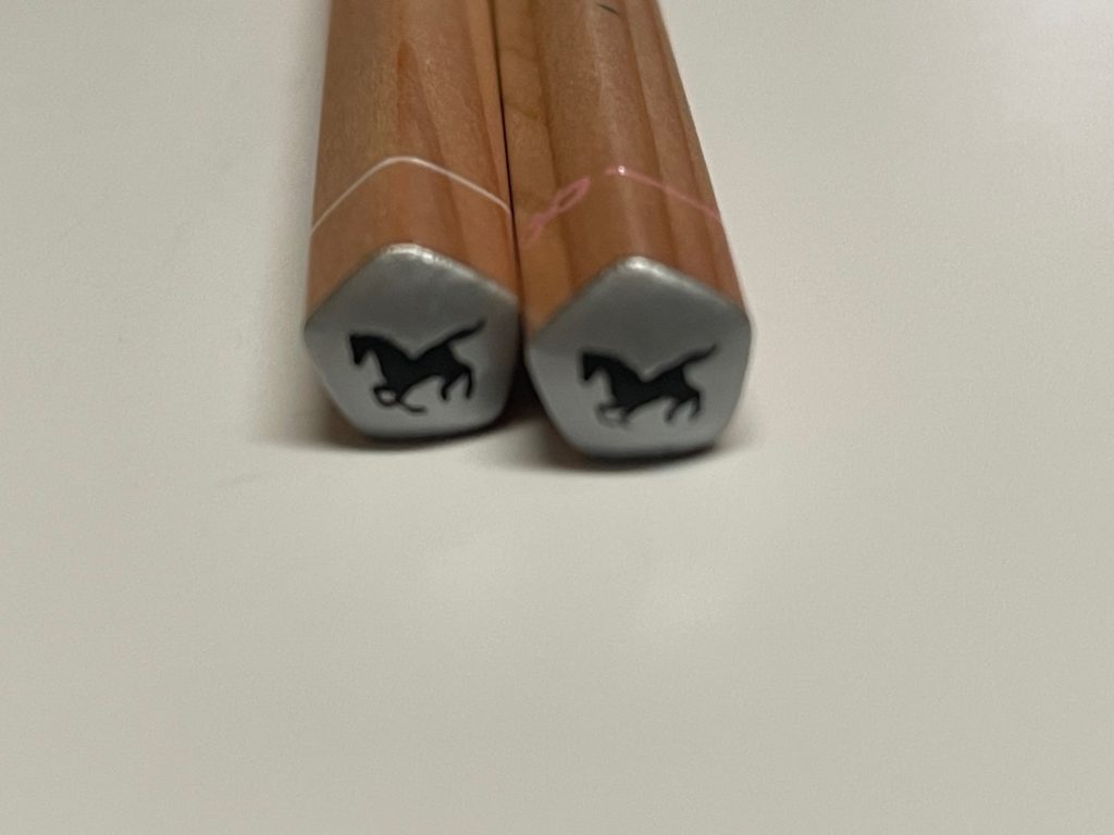 特長④! おー!こんなところに「絵馬」がありますよ! そういえば神社で願い事を書くとき「絵馬」を購入しますよね、古来より馬は神様の乗り物として、神社に奉納されていたと言われています。縁起が良いのですね! ちなみに今回紹介しているのは背景が銀色の絵馬ですが、金色版(こちらは2B)がありますが、2Bなので低学年向けの合格(五角)鉛筆なのでしょう。