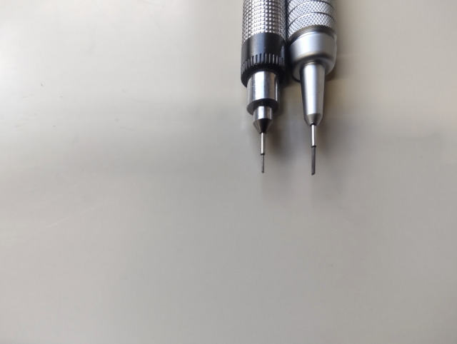 やはりペン先(スリーブ)が長いことでしょう。ほとんどの製図用シャーペンは長いペン先が採用されています(だいたい4mmくらいかな)。作図に用いる定規はわりと厚いのでないと定規に当てられません。また、書きながら紙面が見やすくなるため、細かい作業に向いています。