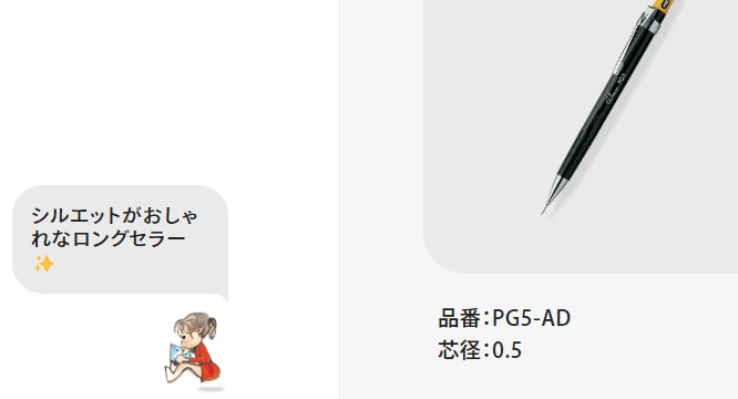 上の画像はぺんてるさんホームページ。グラフペンシル紹介ページをロールダウンしていくと画面の左下にかわいらしい女の子が登場し、ひとこと話してくださります。「シルエットがおしゃれなロングセラー」