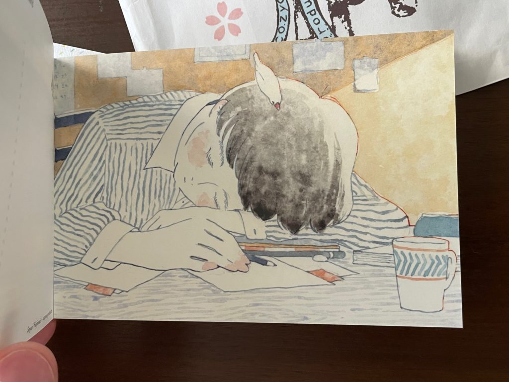 どの作品も素敵です! 1作品だいたい3色くらいしか使ってないんですよね、シンプルです。タッチもさらっと描いている感じなのですが、主人公さんの表情に惹かれます。愛しくて、そして「がんばれ!」と応援したくなる表情です。そんな作品を描かれたのが「藤巻佐有梨」さんです!なんと名門早稲田建築出身!私、個人的に建築士試験受験を応援しているので、こうして建築出身の方が別世界で活躍されるのも嬉しいですね。この方に私の似顔絵描いていただきたいです(勿論代金はお支払いいたします!)。。あと、「描く」を生業にしようと思ったキッカケなど聞いてみたいな。 全5柄が各2枚合計10枚という構成です。10枚楽しめて税込495円は私の中ではメッチャお得です!しかも2枚ずつありますから、1枚は誰かへのカード、1枚は自分用にということもできちゃいますね、良き良きですよ〜^_^