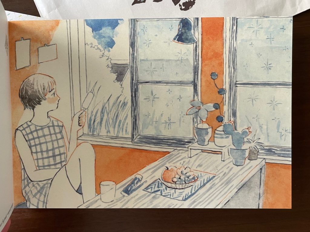 表紙と同じです。夏のひとときかな。アイス美味しそう。そして外を見ながら何を思われているのでしょう。こういった時間、大切にしたいですね。