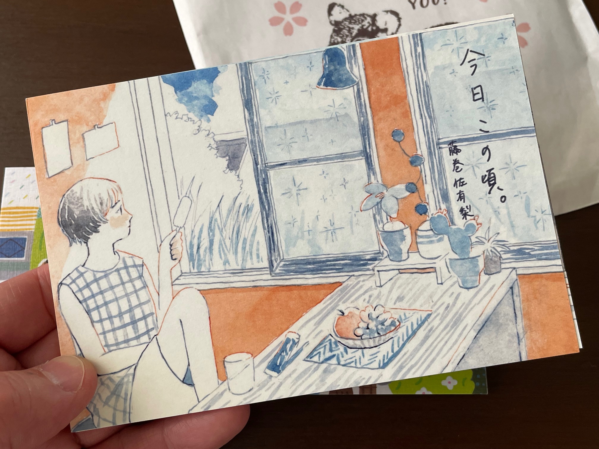 どの作品も素敵です! 1作品だいたい3色くらいしか使ってないんですよね、シンプルです。タッチもさらっと描いている感じなのですが、主人公さんの表情に惹かれます。愛しくて、そして「がんばれ!」と応援したくなる表情です。そんな作品を描かれたのが「藤巻佐有梨」さんです!なんと名門早稲田建築出身!私、個人的に建築士試験受験を応援しているので、こうして建築出身の方が別世界で活躍されるのも嬉しいですね。この方に私の似顔絵描いていただきたいです(勿論代金はお支払いいたします!)。。あと、「描く」を生業にしようと思ったキッカケなど聞いてみたいな。 全5柄が各2枚合計10枚という構成です。10枚楽しめて税込495円は私の中ではメッチャお得です!しかも2枚ずつありますから、1枚は誰かへのカード、1枚は自分用にということもできちゃいますね、良き良きですよ〜^_^