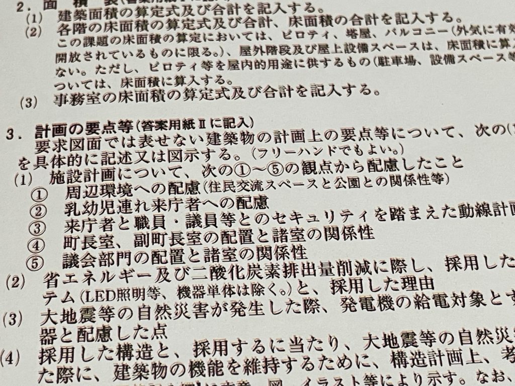 ①周辺環境への配慮 ②乳幼児連れ来庁者への配慮 ③来庁者と職員、議員等とのセキュリティを踏まえた動線計画 ④町長室、副町長室の配置と諸室の関係性 ⑤議会部門の配置と諸室の関連性、と全5問出題されました。ここはある種「文系要素の強い質問」ですから理系が集う受験者には難しいかもしれません。計画の要点の計画はいつも難しいですけどね。でもこここそ自分の言葉か否かがわかるのかもしれません。その結果、図面と要点記述の整合性がとれず、、という状況だったと思われます。しかも今年の課題は高水準図面でしたから、図面で差がつきにくい、そうなると計画の要点で差がつきやすかった、というかそこでしか差がつかないといった方が良かったかもしれません。