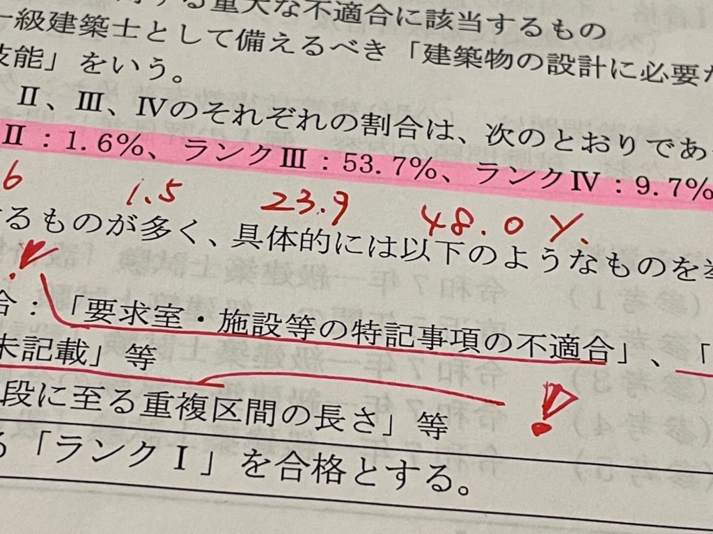 この試験、採点に時間がかかります。しかも学科試験と違い、不合格の明確な理由がブラックボックス化されています。だから、うがった見方をしてしまいます。なんといいますか、、試験元が採点を楽にするために、多くの受験生が間違っているところを見つけて、ランクⅢにしているように思えてしまう。。ランクⅣの判定はランクⅡやⅢより難しくないと思っています。重大な不適合や未完成ですから発見も簡単。でも今年の課題はほぼ全員が描きあがり、かつ時間に多少余裕が試験でしたから、差がつきにくい。差がつきにくいと採点が難しい。だからなんとかランクⅢをつくるための材料を、、そんなことを考えてしまうのは私だけでしょうか。。