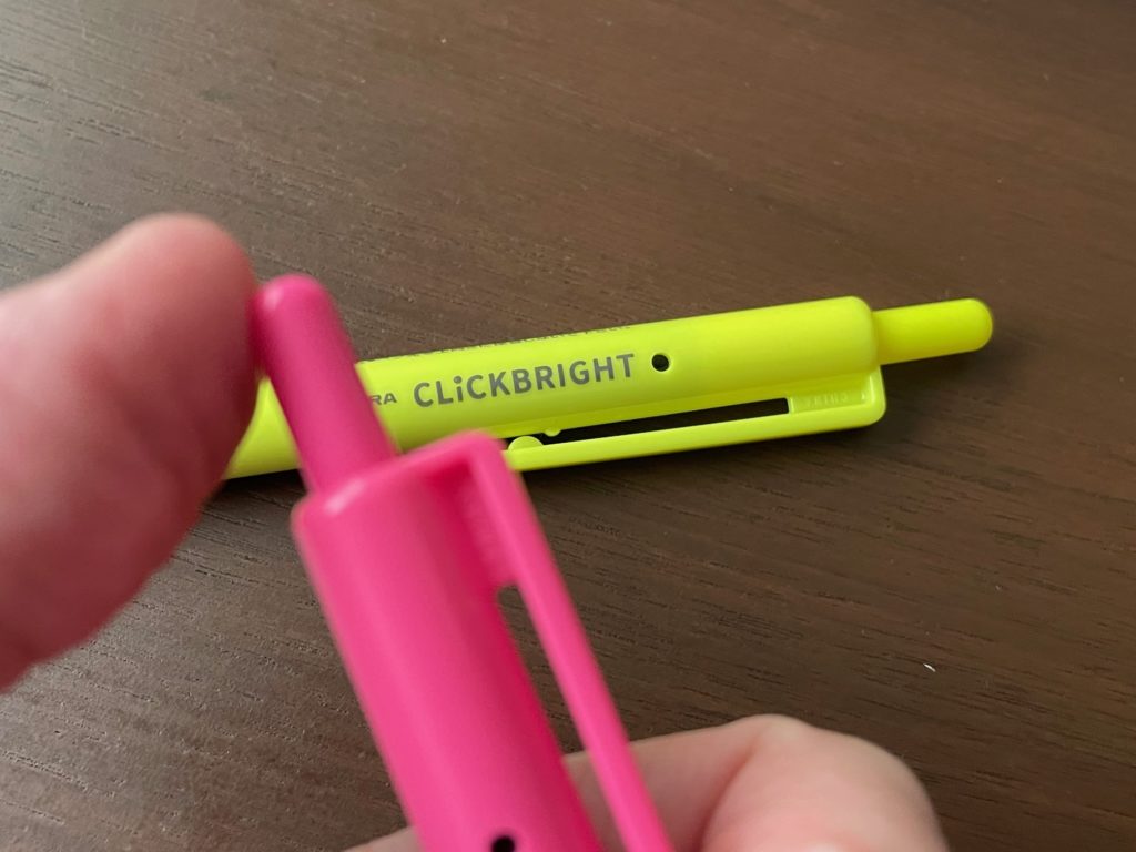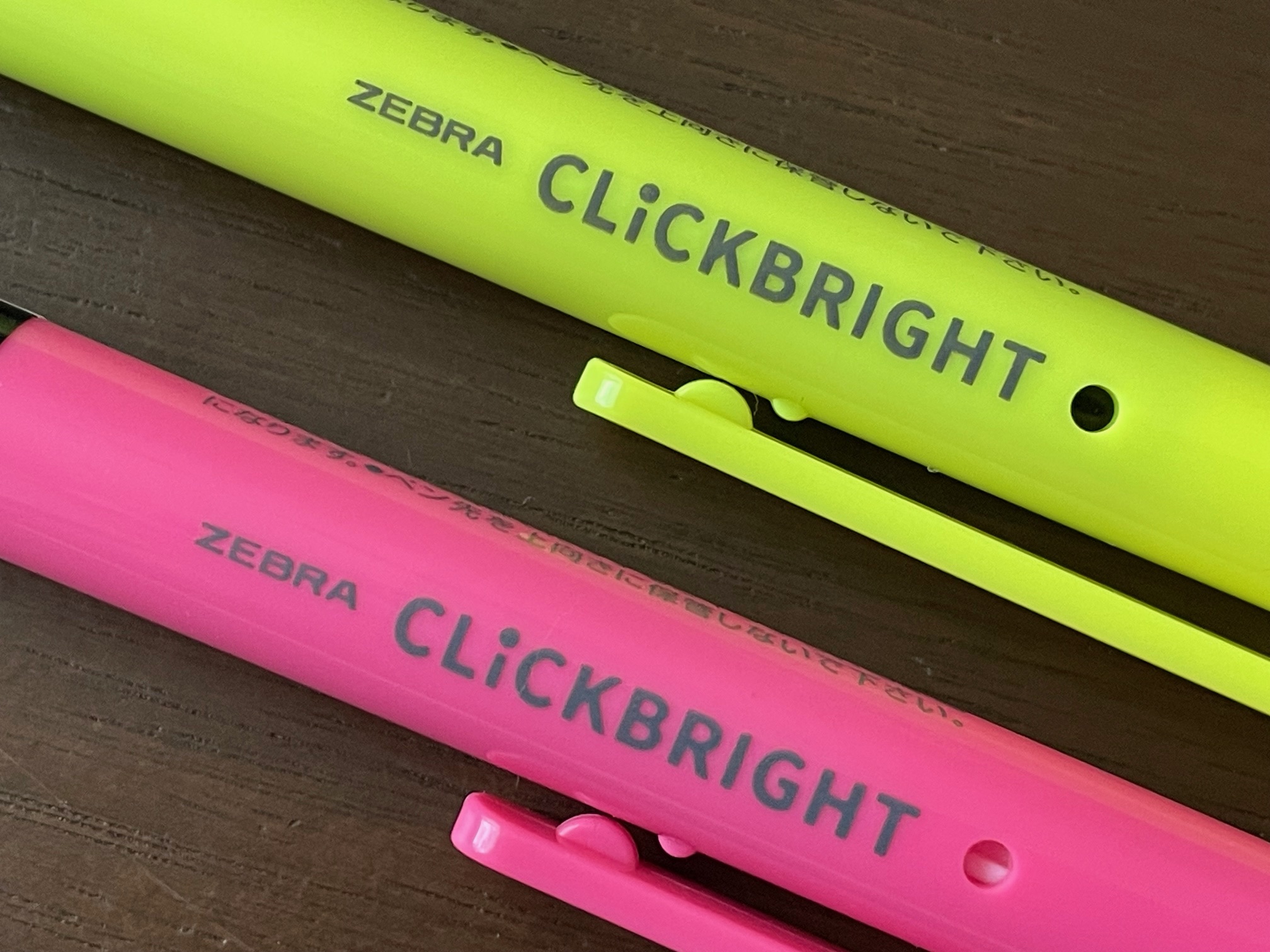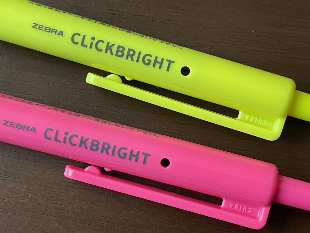 じゃん!こちらです! こちらがCLICKBRIGHT(クリックブライト)です! ぱっと見ですが、蛍光ペンに見えませんよね? どちらかといえば、水性ペンのように見えませんか? こちら、蛍光ペンなのです~。いつもお世話になっていますZEBRA(ゼブラ)さんです!