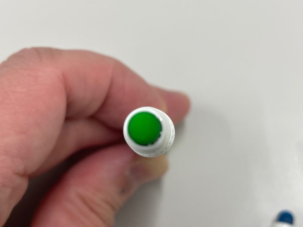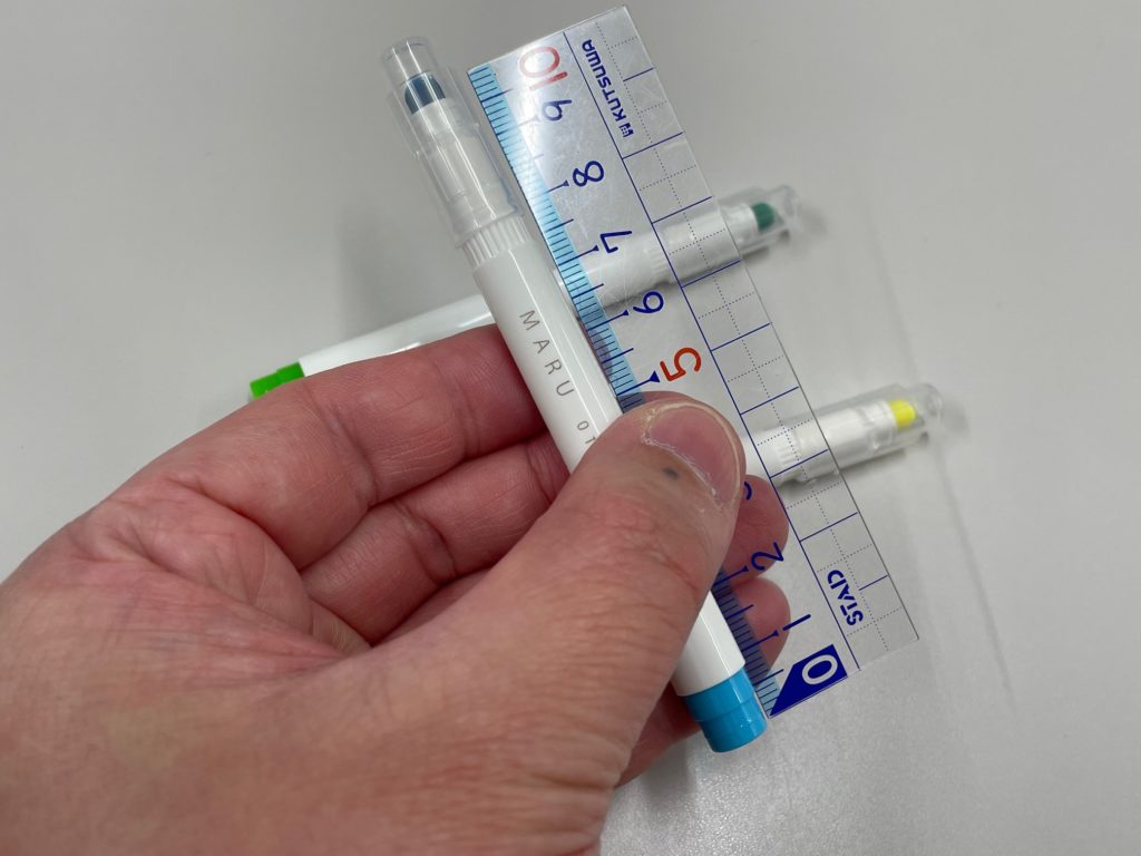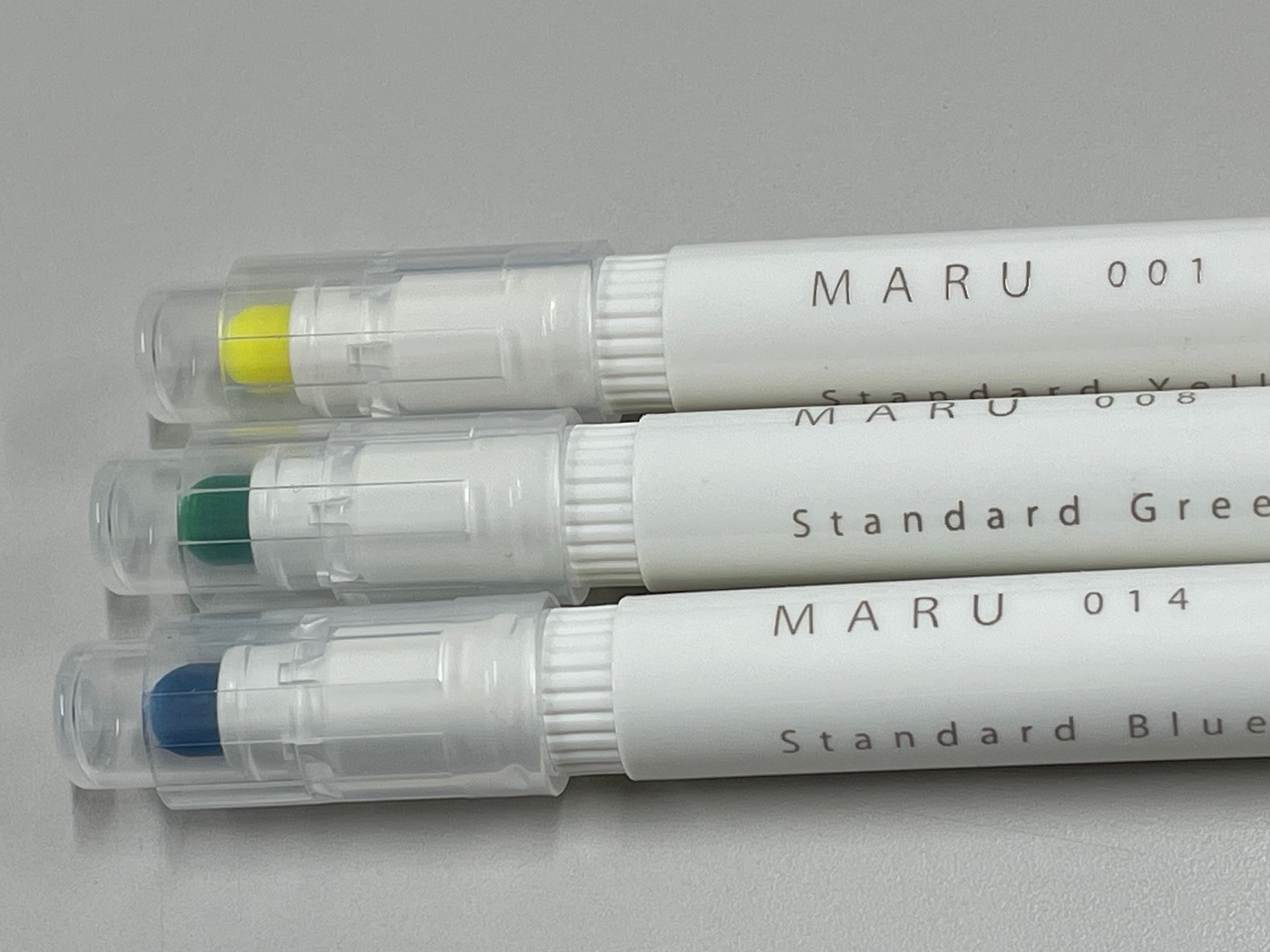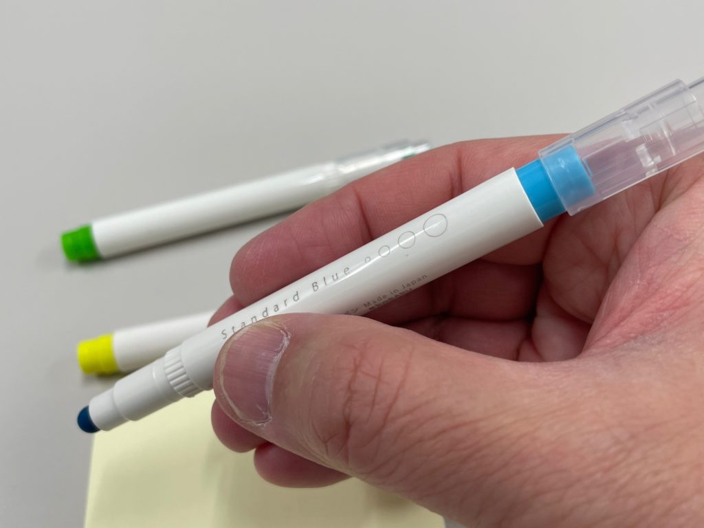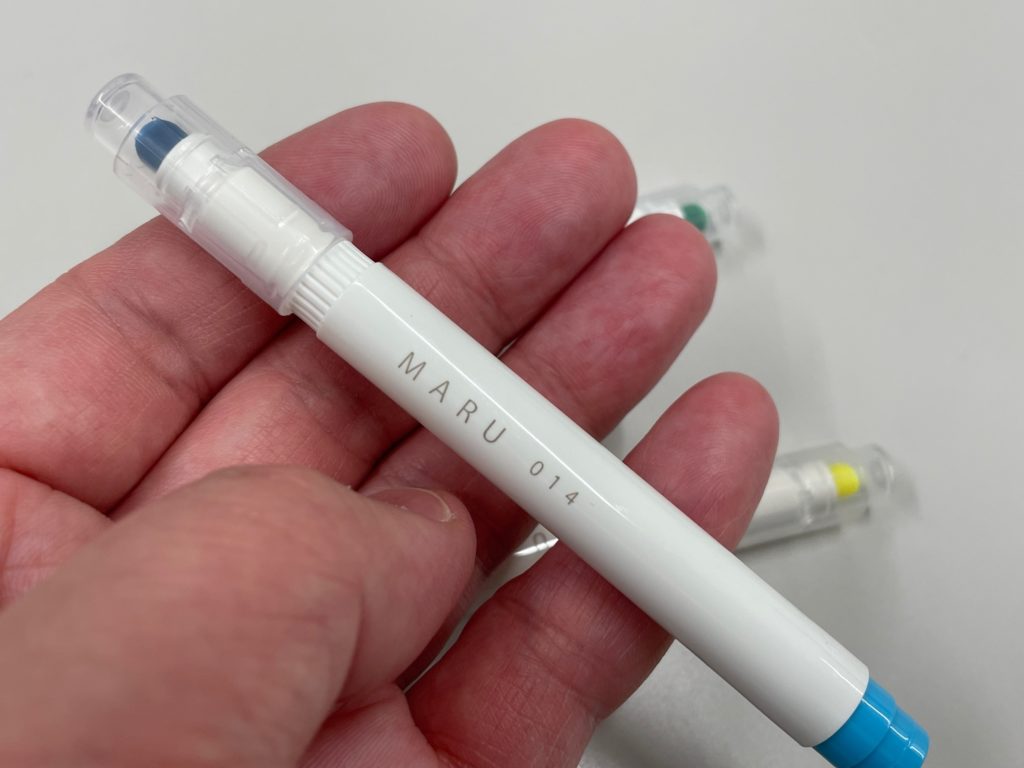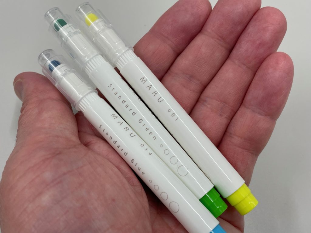 ボディには「MARU」と「014」という数字がクレジットされています。この番号が「色」ですね。ちなみに色は全24色、今回私が紹介しているのは3本。画像にある「014」が「スタンダードブルー」です。他は「001 スタンダードイエロー」「008 スタンダードグリーン」がチラホラ画像に登場してくれています。個人的にはこの番号表記が好きだなあ。私、世代ではないのですが石ノ森章太郎先生の代表作「サイボーグ009」、個性あふれる9人のサイボーグたちが悪と戦うのですが、主人公の名前が「島村ジョー」といい、「009(ゼロゼロナイン」と呼ばれています。この番号表現、好きです~(笑)。色は全24色展開されています!