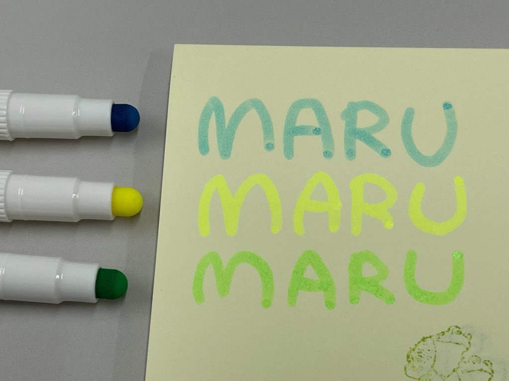 それぞれ書いてみました! 思ったよりイエローが発光しています。書き心地ですが、すべりやすいというよりは、もちっとした走りです。文字を書いたりデコレーションするのに適している気がします。