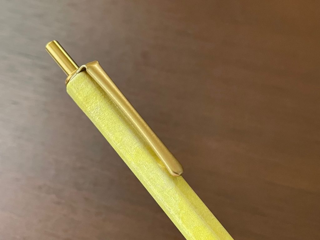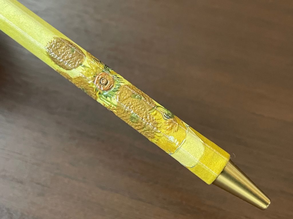 ついつい、パッケージや絵画に目が行きがちですが(それでいいのです!)、その分脚光を浴びにくい部分も撮影しました。ゴッホさんの作品なので、画像のような色になることは当然ですが。グリップとノックのゴールド、そしてボディの黄色(レモン色)が高級感を醸し出してくれています、しかもこちらのアイテム税込み1,500円ですよ!飾らないお土産、飾らないバースデープレゼントに丁度良きですよ!!