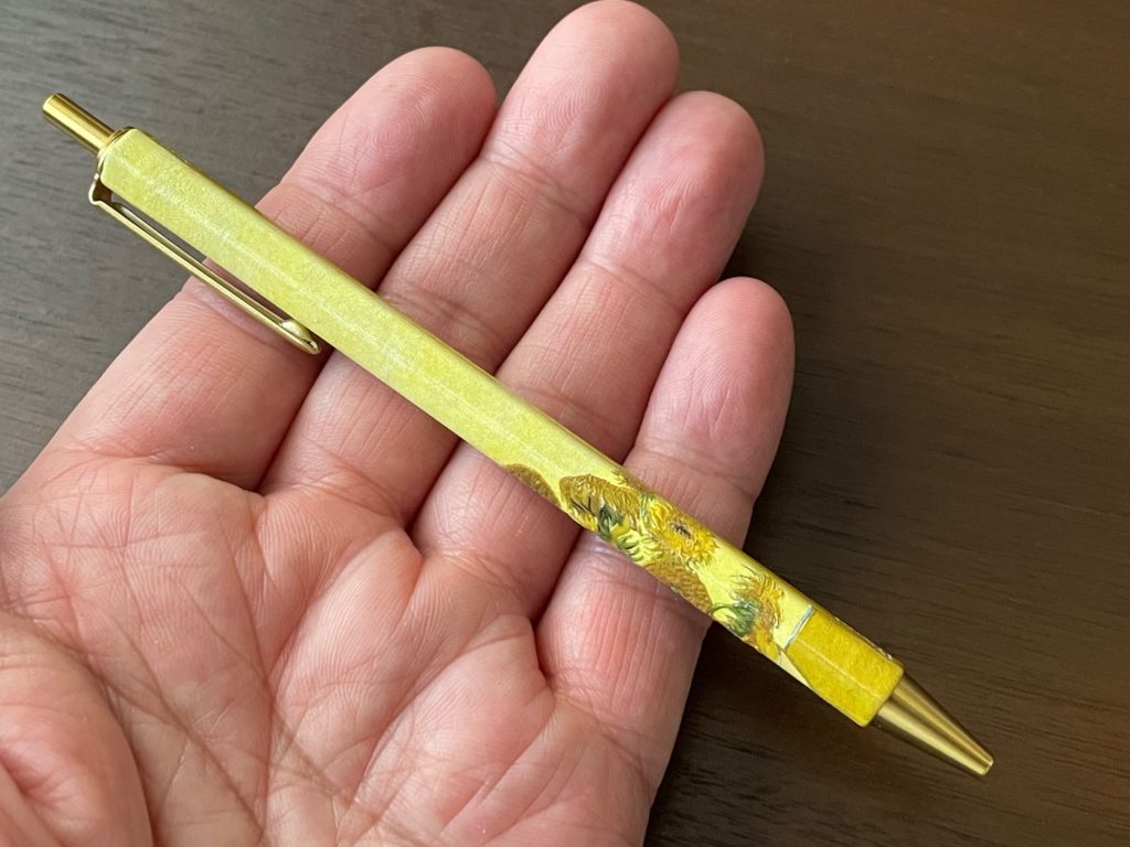 そして、蛇腹から登場しました!「アートペン ゴッホ ひまわり」。私のような美術無知でもゴッホは知っています。ひまわり、正確には「花瓶のひまわり」ですが世界に六点現存しています。ついでに私の無知を言いますが「花」についての知識、ほぼゼロです。ゼロですがひまわりは大好きです。夏の花の代名詞。そんな大好きなひまわりが傍にいてくれます。うれしいです。そして私の好きなサイズ感です。ちょっと小ぶりなのがまた愛おしいです!
