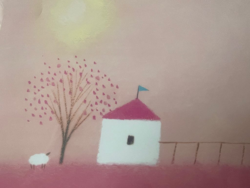 すこーし拡大しました。ピンクがいい感じですよね。草原?もピンク、空もピンク、お花もピンク、そして、My Pink Roof Homeですから屋根もピンク。でも景色というか空がなんとなくピンクっぽいかんじの時ってありますよね。昔、ひたち海浜公園でみた一面コキアの赤を思い出しました(色は違うけど)。あと、秩父の芝桜!これも良き! ピンク80%以上なのですが、しつこくないし温かいですよね、とっても優しい気持ちになります。5種類ありましたが、わりと迷わずこちらを選ばせていただきました。もちろん、他もすばらしいものばかりです。