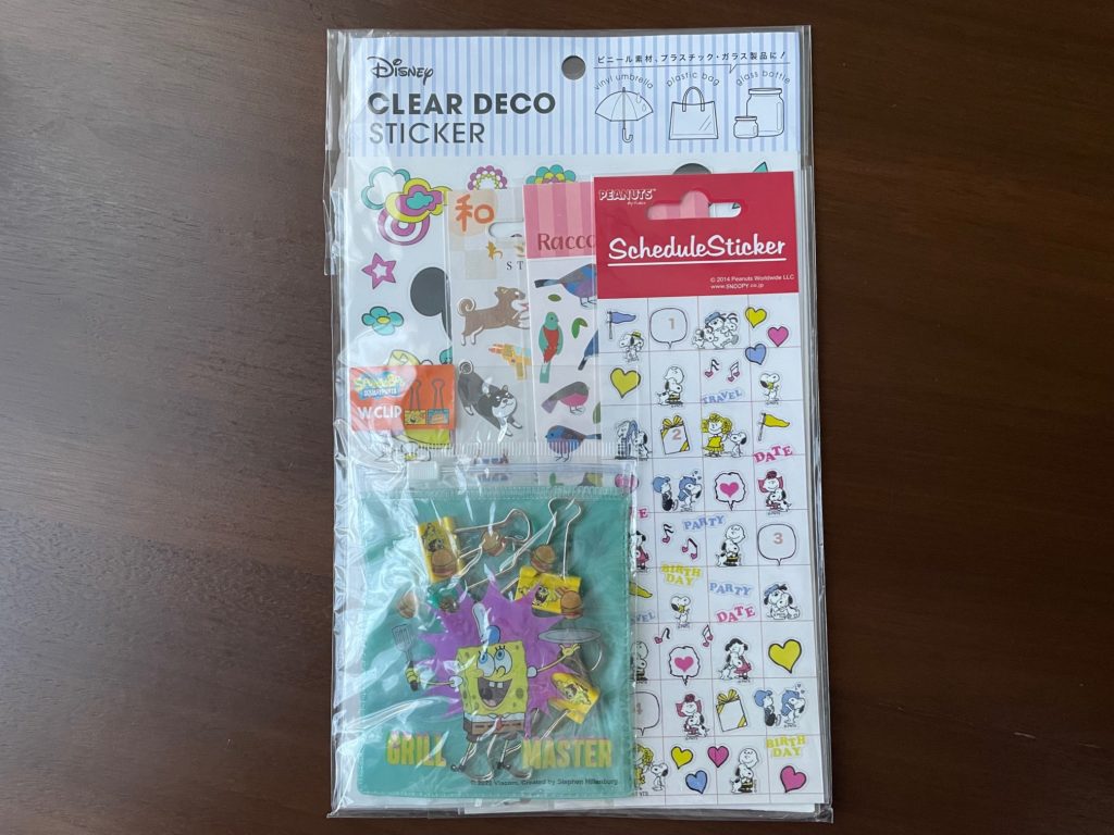 早速開封しました!開封しましたが各アイテムたちがバラバラになっていません。良き配慮です、こういうの嬉しいです。背中部分にセロハンテープなどで固定してくれているので、開封後も整理されていて助かります。そういえば、花火セットもバラバラしないようテープで固定されていましたね。あれはいざ花火をするときに結構困りましたが、(笑)。先に結論から言いますと、シール(ステッカー)が全9種類、クリップが1つ、合計10アイテムがぎっしりです!それでお値段税込み550円ですから、買わない手はなし! S&Cコーポレーションさんに敬意を表してひとつひとつ画像をお見せしたいと思います。