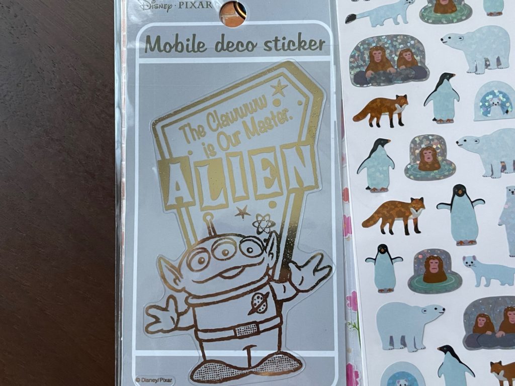 どんどんいきましょう! Mobile deco sticker ALIEN(エイリアン)です。携帯電話の後ろに貼るステッカーですよね。トイストーリーから「エイリアン」さんです。いつもの緑色ではないのが逆に新鮮です!