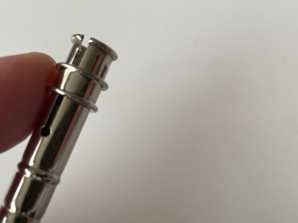 こちらが鉛筆をホールドするところですね。左下に少しだけ見えます私の指。金具についている輪っかみたいなものを、、
