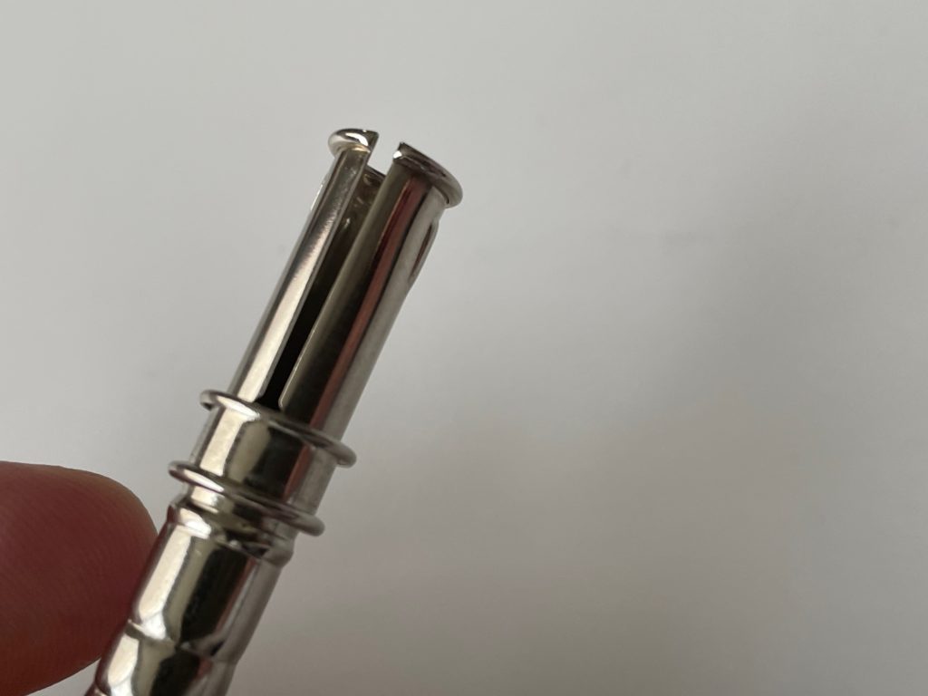 サイズ感はこんな感じです。冒頭で、野球のバット、というよりベースボールのような、、という表現をしましたが皆さんはそのように見えました?現代のバットというよりは、昔のバットのように見えませんか? どこか懐かしい形ですよね! さっそく短くなった鉛筆を装着してみましょう!