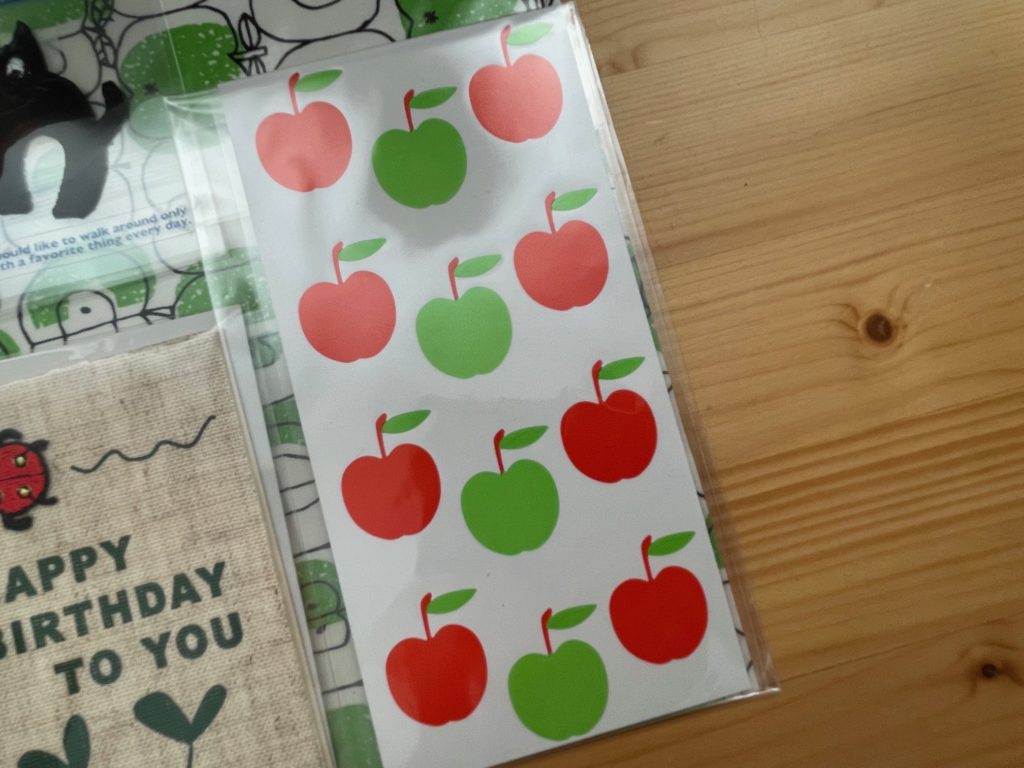 こちらはステッカーですね。かわいいりんごと青りんごですね。こちらも開封の開封をしたいと思います!