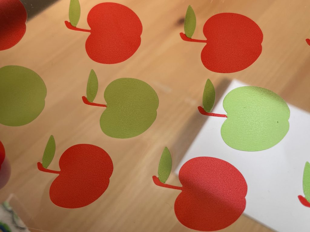 ちょっとアップしました。透き通っているのがわかりますね。りんごたち全部で12枚あるから、月初めに1枚貼ってちょうど1年とか、、いずれにしてもかわいいりんごさんでした。